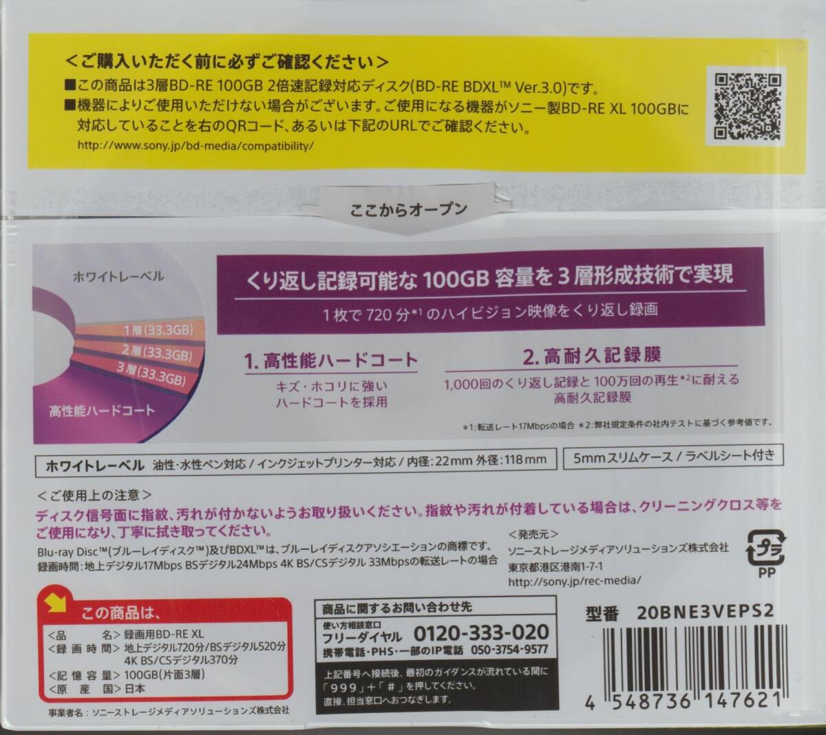 Product name: 【未開封新品】SONY くり返し録画用 100GB BD-RE XL (20枚パック)