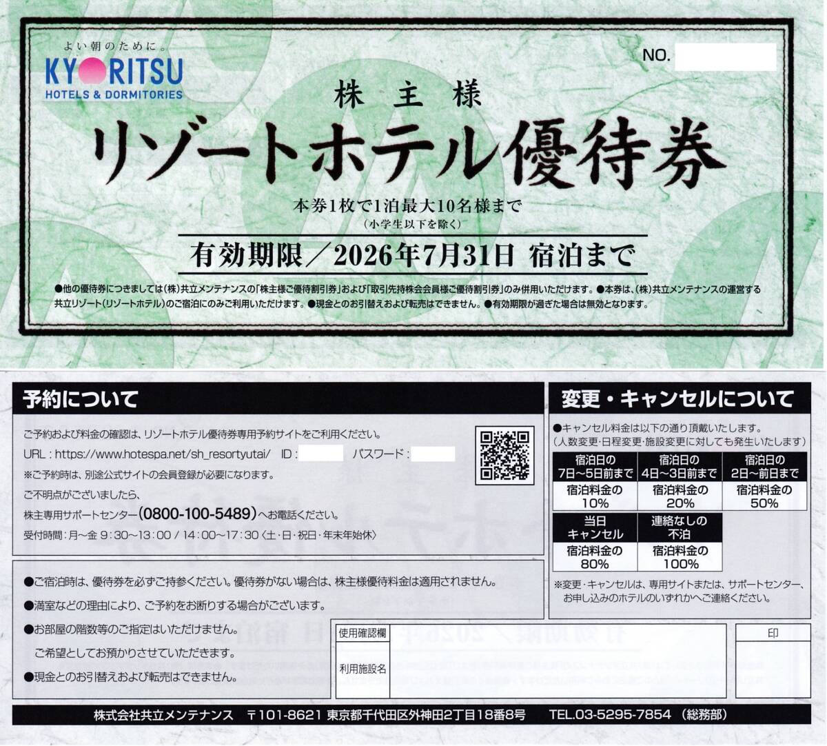 Product name: 最新【送料込み580円】共立メンテナンス株主優待券 リゾートホテル優待券(1枚) 2026年7月31日迄