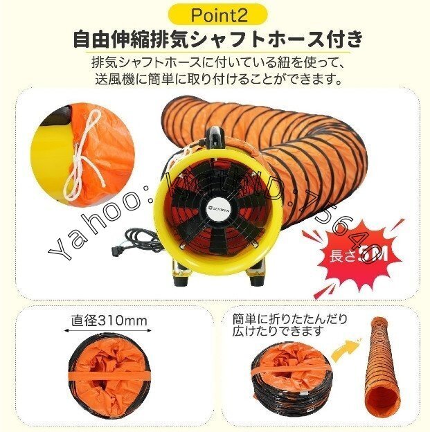 • ◎03 自由伸縮排気シャフトホース付き排気シャフトホースに付いている紐を使って、送風機に簡単に取り付けることができます。(直径310mm 長さ5000mm)簡単に折りたたんだり広けたりできます。