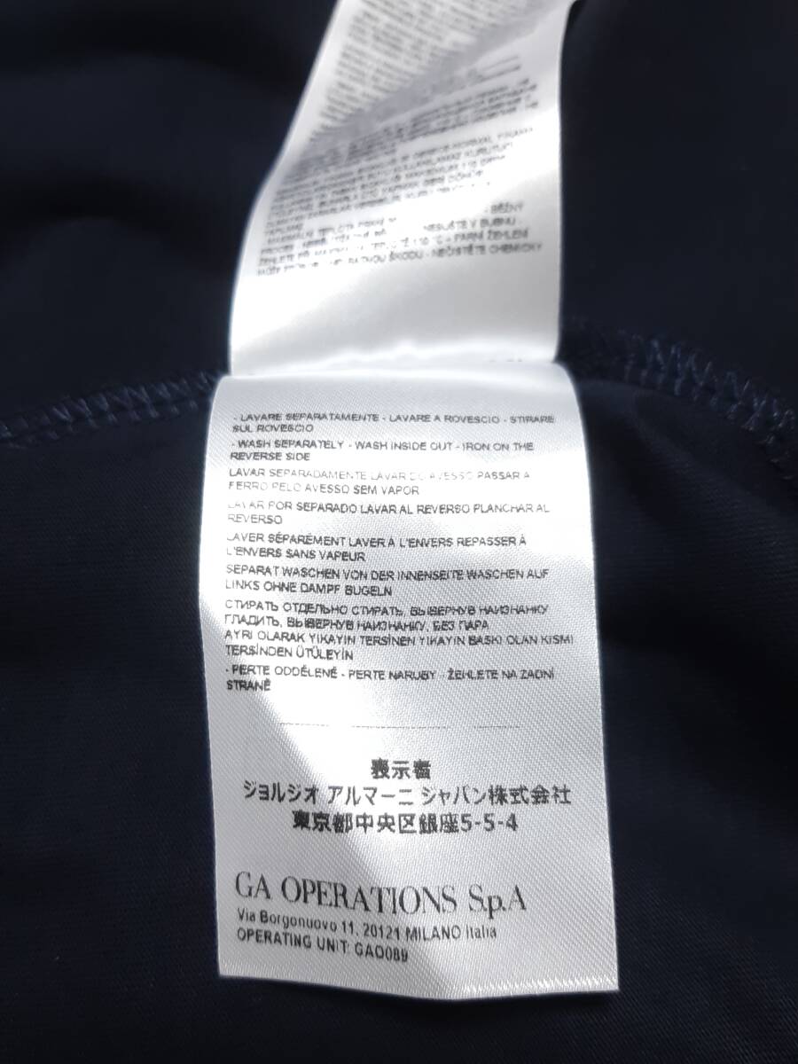 現在は並行輸入品でも、服の内部に付いた品質表示のタグには日本語で、【表示者 ジョルジオ アルマーニ ジャパン株式会社】と記されていることを理解しておいてください。また、輸入元の海外は日本ほど商品の扱いが丁寧ではありません。生地に若干のスレなどがある場合があり、目立つものは記しますが、目立たないものに関しては記しませんので、完璧な商品をお求めな方は正規店をご利用ください。