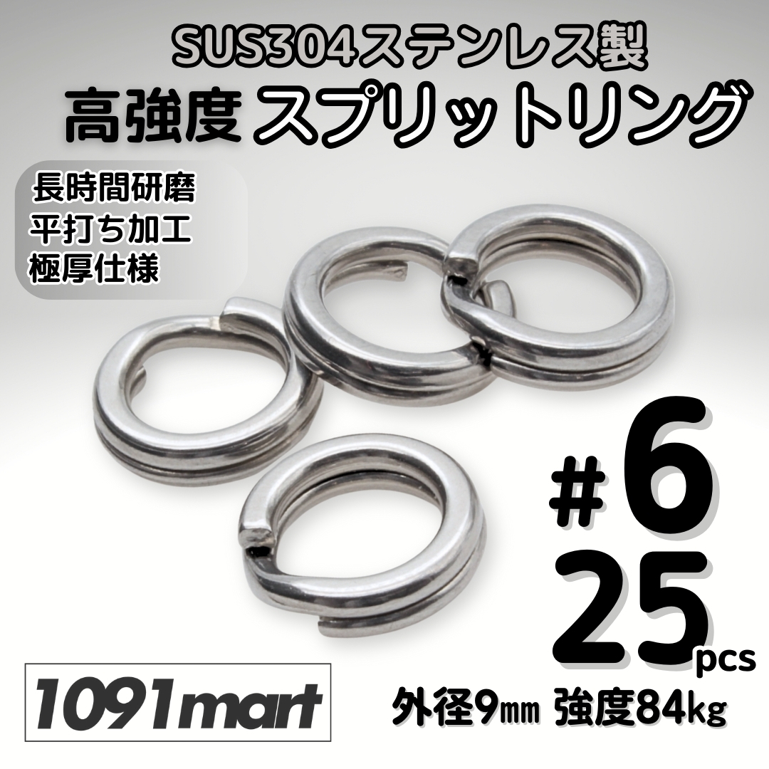 平打ち 強力 スプリットリング #6 25個セット最強素材 SUS304ステンレス製 ソルト対応品 長時間研磨 極厚仕様【1091mart】