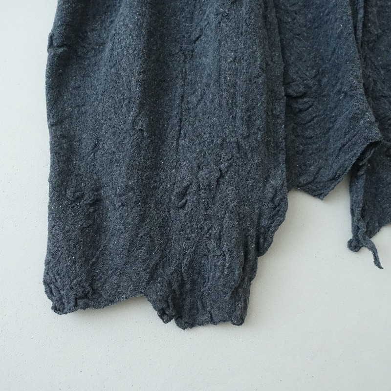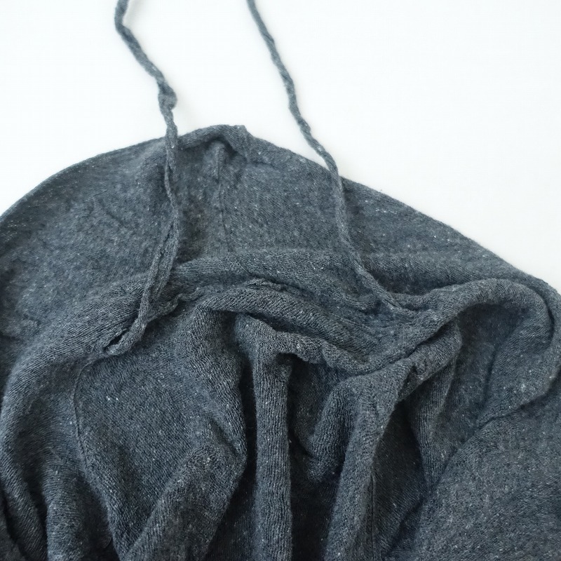 JURGEN LEHLのネップニットミドルカーディガンです。カラーはダークグレーで、ホワイトのネップ入りの所々に凹凸のある編み柄の薄手ニット素材で仕立てられております。襟元にひもが付いております。