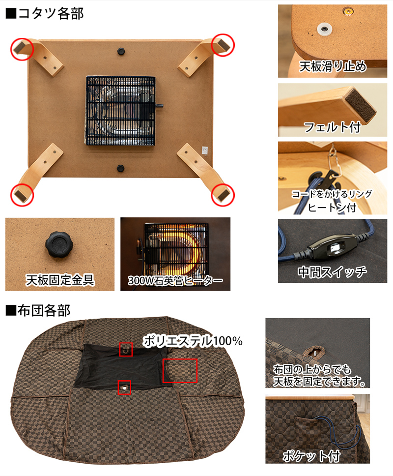 材質 コタツ/天板:合成樹脂化粧繊維板(PVCシート貼り)、フラッシュ構造(芯材ハニカム使用)