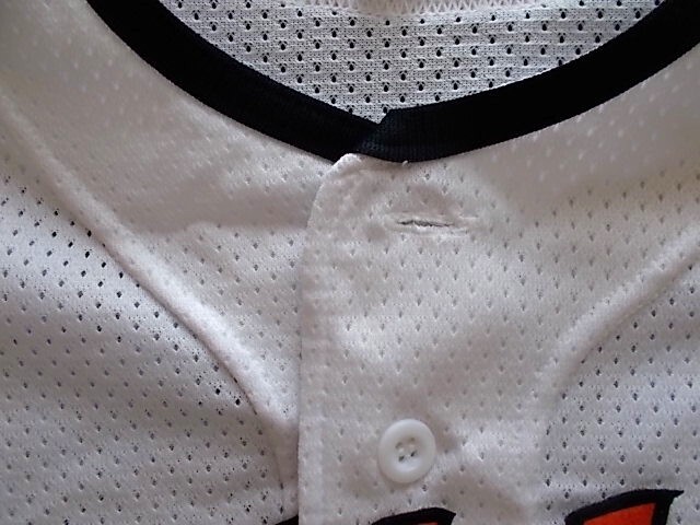 ■質:一番上のボタンがなくなっています。胸のロゴ、圧着が弱まって一部はがれています。バックナンバー、部分的に細かなかけ。生地は部分的にシワはありますが、特に目立つようなダメージはありません。
