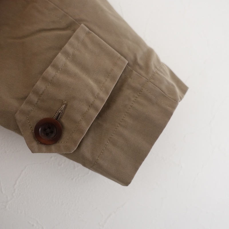MHL.のCOTTON NYLON CANVASライナー付きステンカラーコートです。カラーはグレージュです。コットンとナイロンのハリのある程よい厚みのキャンバス生地を使用。裏地付きで仕立てられています。取り外し可能のライナーは、ダウン入りのキルティング素材です。スロートタブ付きのシンプルなステンカラーコートで、袖口はアジャストタブ付き、後ろ裾はベント入り、前両腰にポケットがございます。