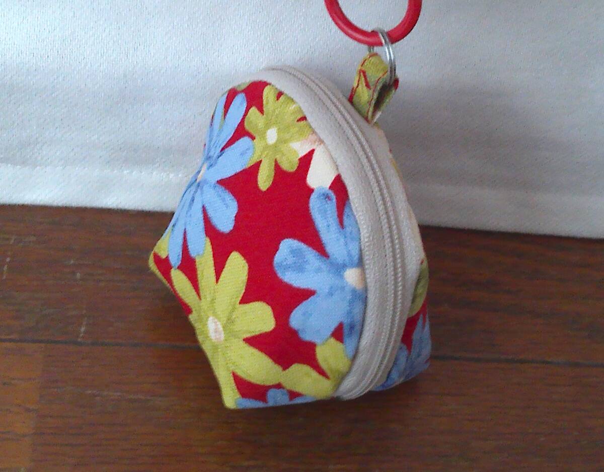 カラビナ付きミニポーチ★赤地ブルーグリーン多花