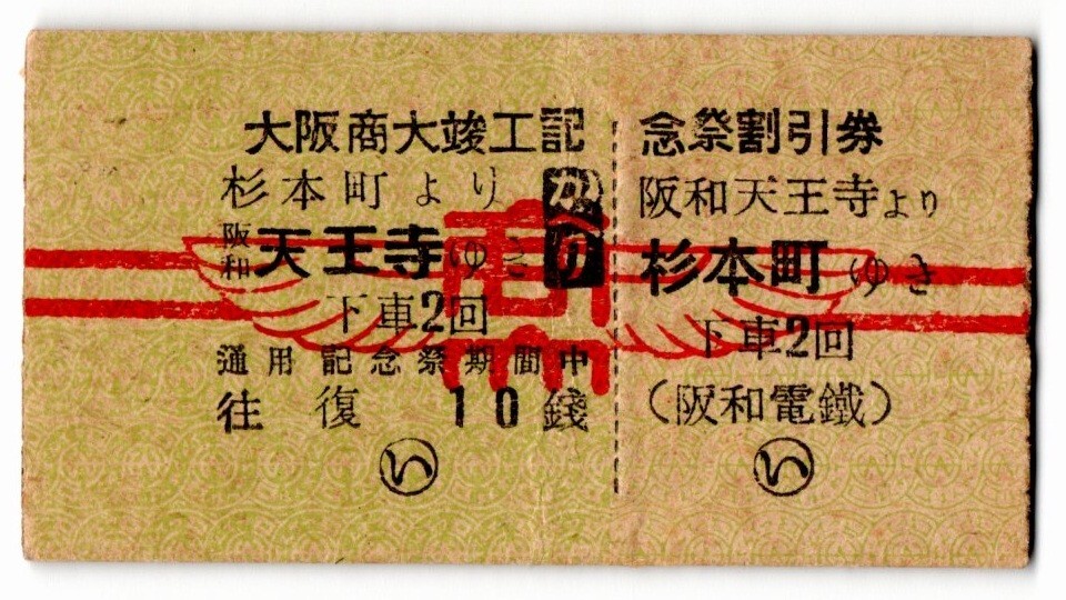 戦前 A型券 阪和電鐡 大阪商大竣工記念祭割引券 阪和天王寺より杉本町ゆき 往復 10銭 阪和天王寺驛發行