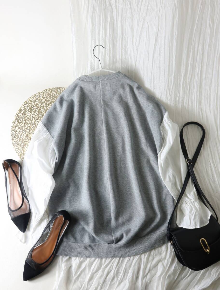張り感のあるボンディング素材と、タイプライターの異素材を組み合わせたプルオーバー。 袖がタイプライターの布帛素材になっており、ギャザーでふんわりとした袖がポイント! 袖口はゴムギャザーになっているので、袖をたくし上げて頂くとボリューム感が更に強調され◎ 後ろ丈が長いシルエットで、腰にボリューム感が出る立体的なシルエットです。 着ただけでシルエットが決まり、一枚でサマになるデザインプルオーバーです。