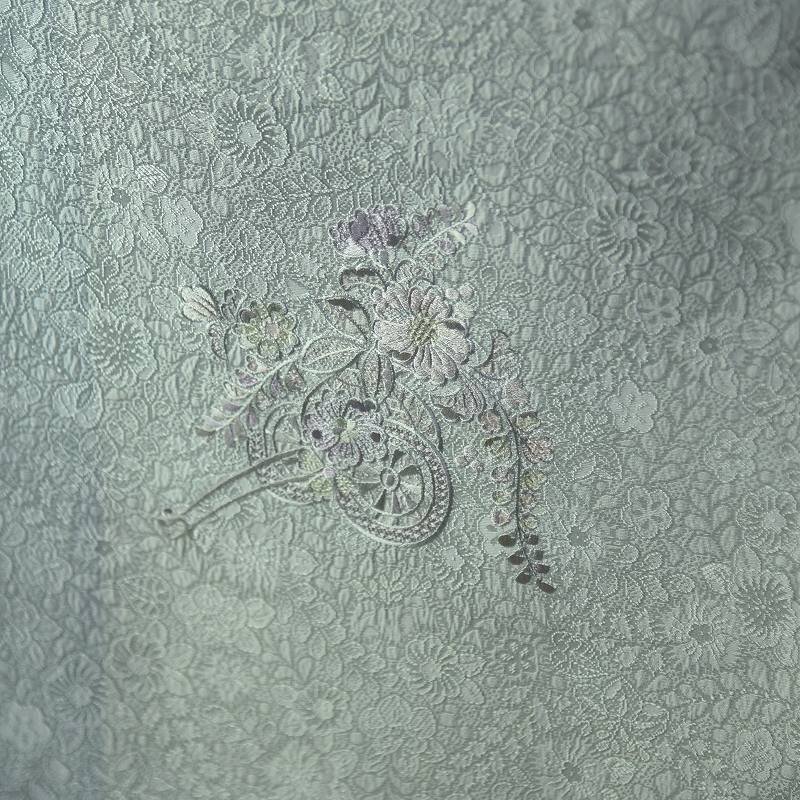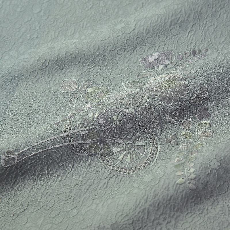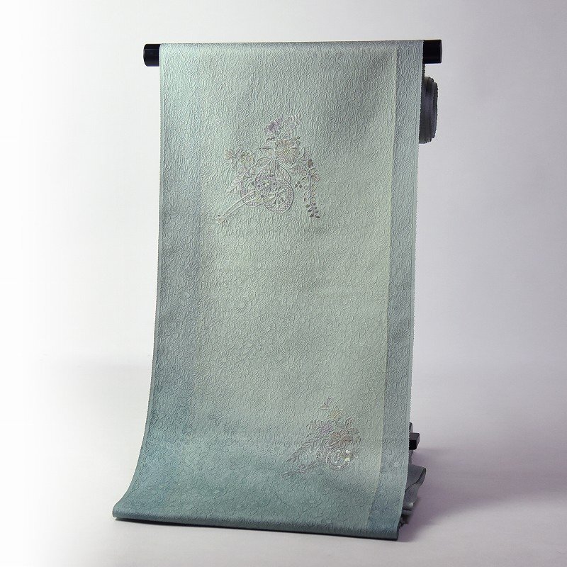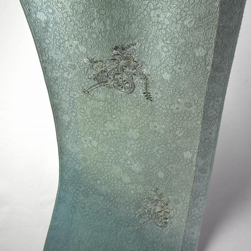 【ほりだし堂】 付下げ ミシン刺繍 花車 辻が花地紋 薄緑色 反物 着物 着尺 八掛付き チャイナドレス 10/19~10/26