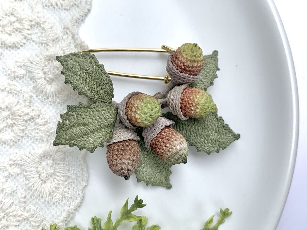 Product name: アラカシ どんぐり カブトピン ブローチ 木の実 茶色 レース編み 80番 ハンドメイド かぎ針編み バッグチャーム ストールピン