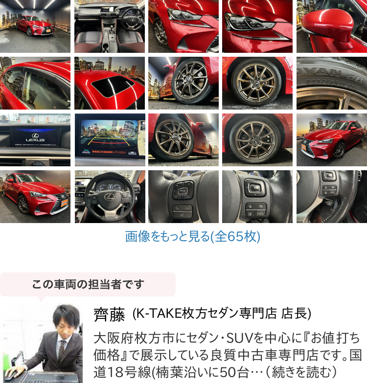 K-TAKE枚方店は国産セダン・SUV・ステーションワゴンを中心に取り扱いしております。趣向性の高い車種になりますので、専門知識を持ったスタッフにてご案内させて頂きます。コーティングやカスタム等はもちろん、任意保険、オートローンまで安心のカーライフをお約束致します。整備、保証などのアフターサービスも当店ですべて行えますのでご安心ください。当社は全国のオークション会場、約160カ所と業務提携を結んでおります。全国60000台以上の中古車を当店でご商談、ご契約、ご納車可能です!