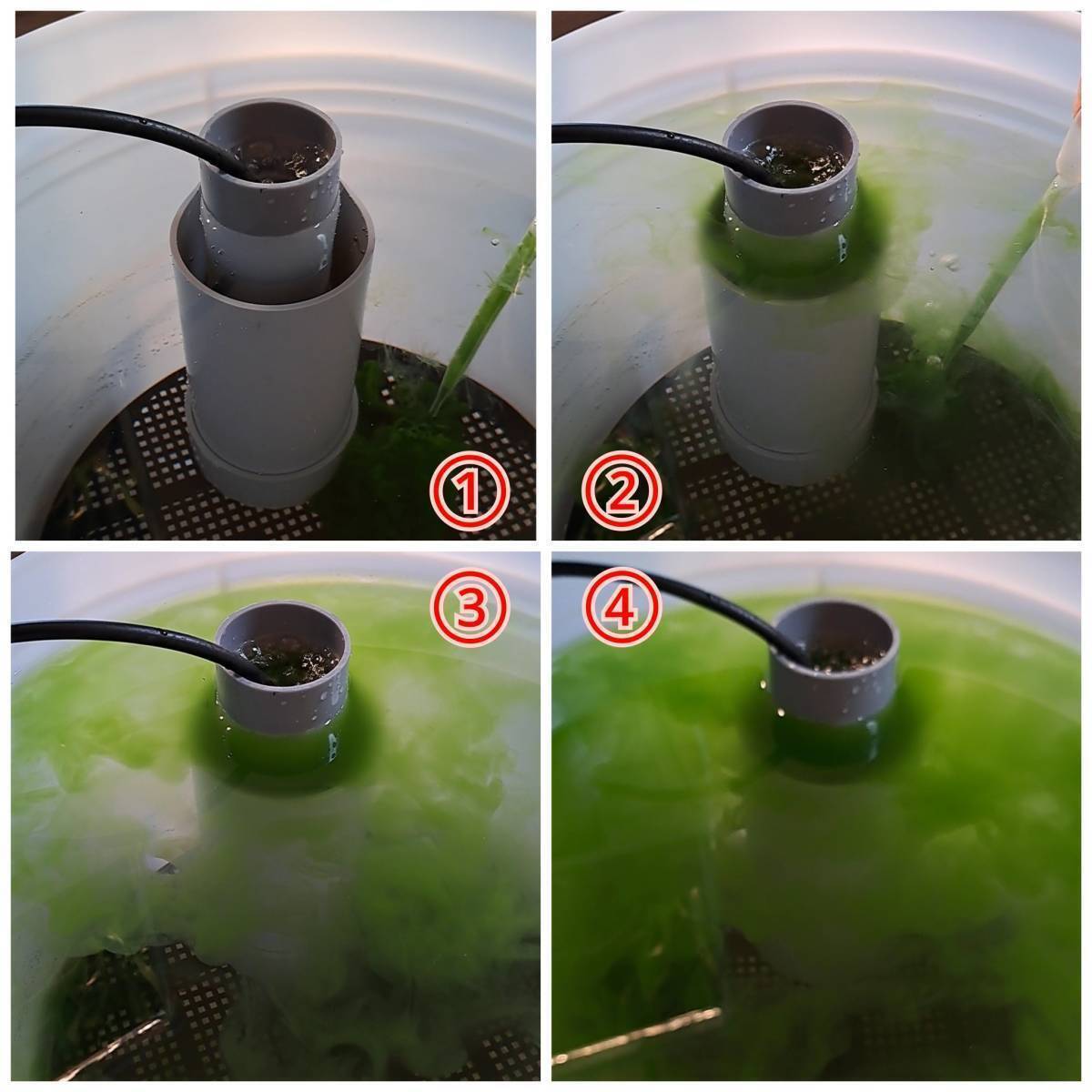 本商品による攪拌(かくはん)の様子です。エアーリフト機能によりミジンコの餌となる生クロレラ(PSB等)が画像にあります様に緩やかに落ちるような水流で良い感じに全体に攪拌される仕様となっております。それに伴いミジンコの死滅を防ぎつつ、飼育密度をあげることが期待されます。