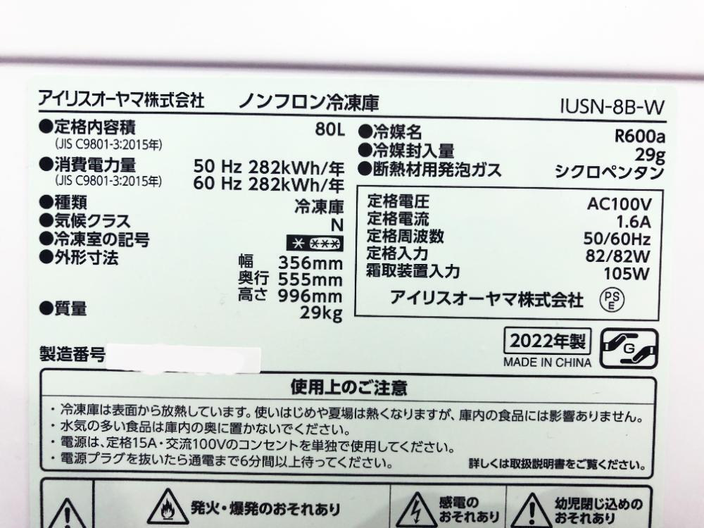 Product name: 送料無料★2022年製★極上超美品 中古★IRIS OHYAMA 80L スキマに入る容量マックス 前開き1ドア冷凍庫【IUSN-8B-W】FNNO
