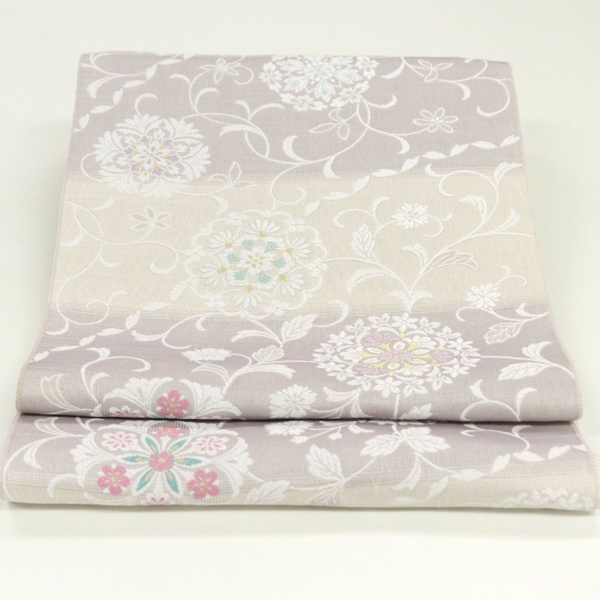しなやかで軽やかな帯地は、オフホワイトと暁鼠色のお色目で横段状にぼかすように織り上げられております。