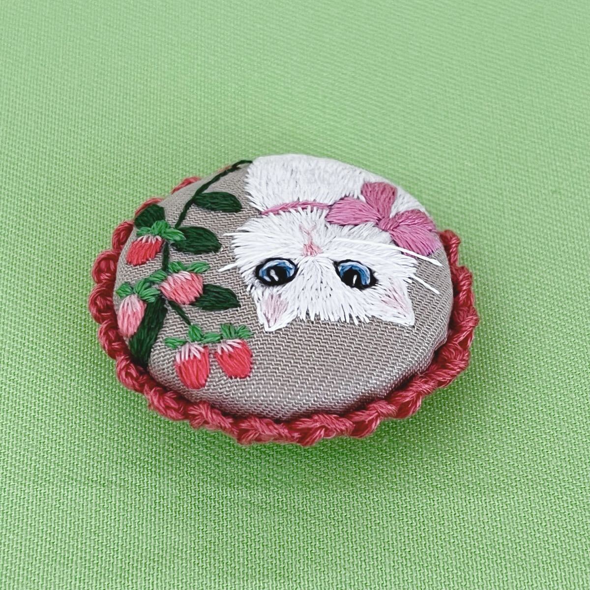白ネコとヒペリカム 1本糸の手刺繍ブローチ アクセサリー ハンドメイド 花 猫 動物 くるみボタン 缶バッジ 羊毛フェルト 刺繍