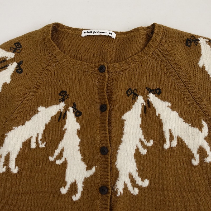 mina perhonenのwolf&flower コットンニットカーディガンです。カラーはライトブラウン×ホワイトの柄編みニット×ダークブラウンのお花の刺繍があしらわれております。フロントボタン開閉で着脱でき、定価(メーカー希望小売価格)52,800円 税込みの商品です。