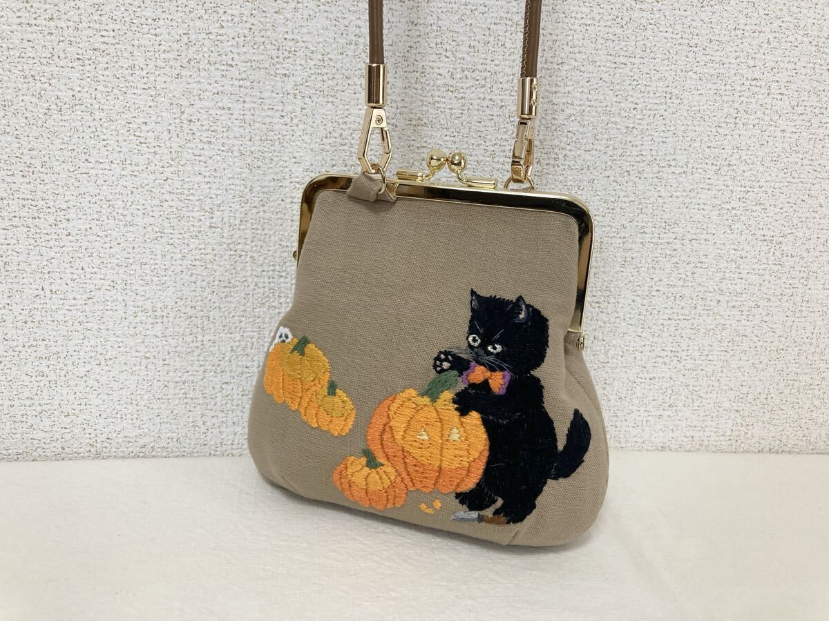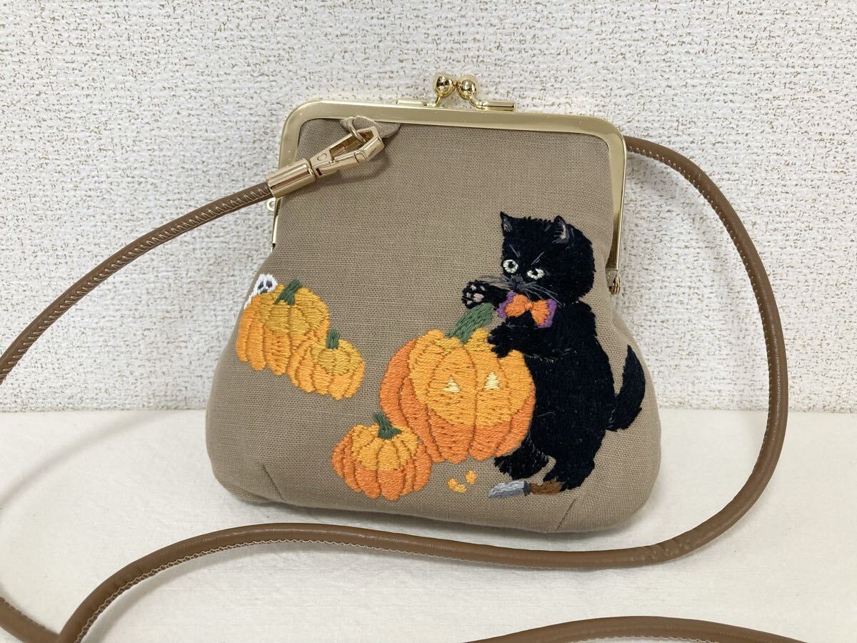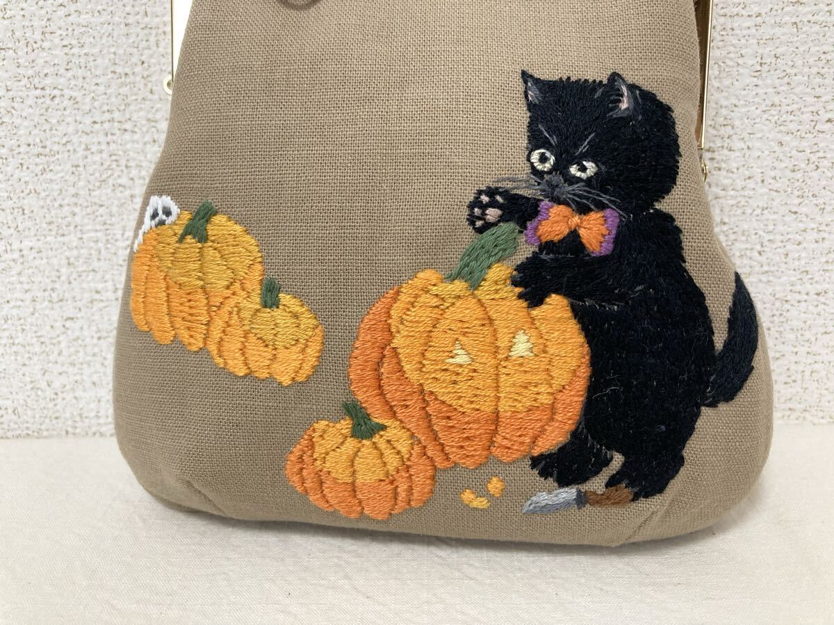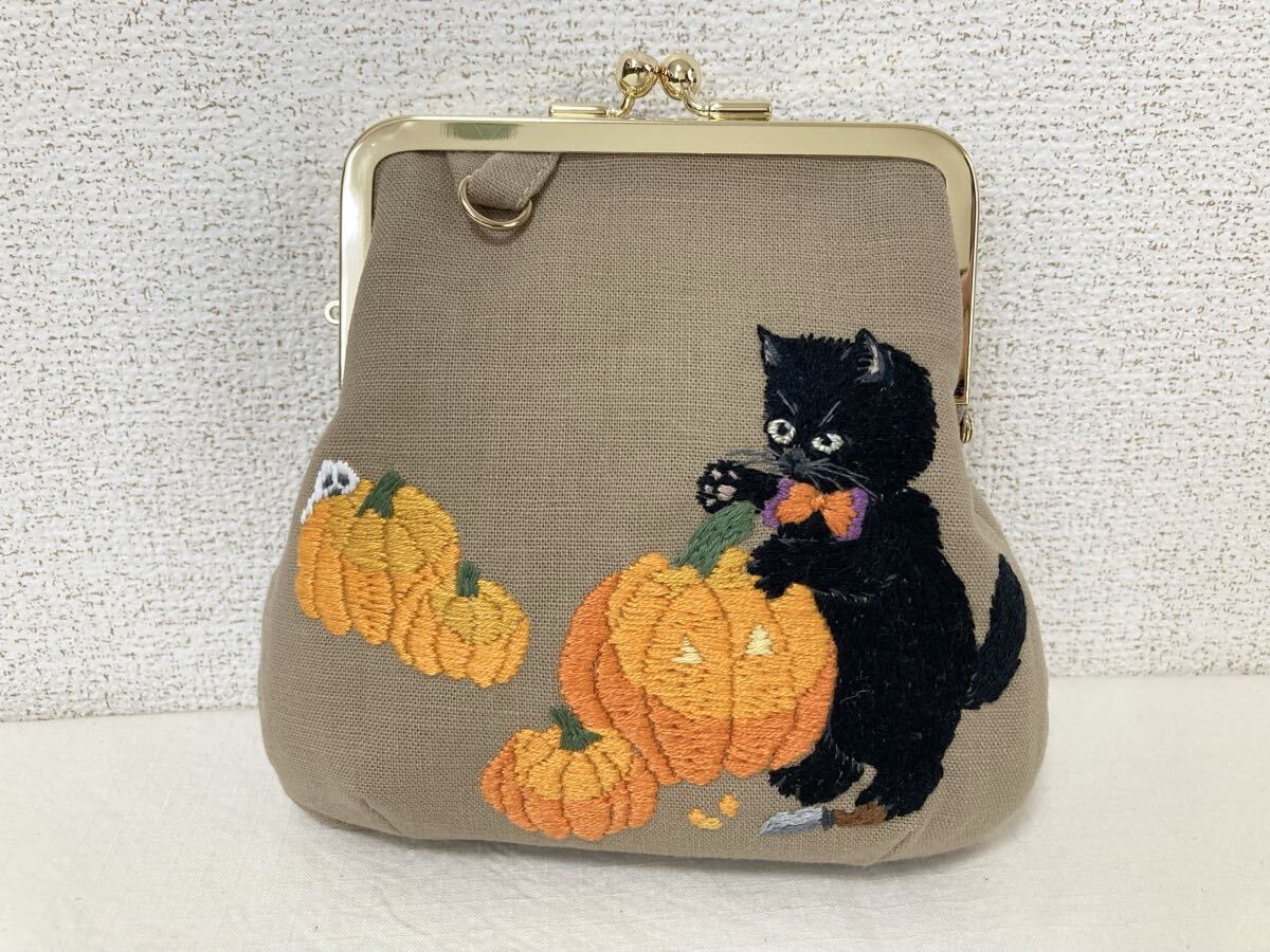 Product name: <jelyglas>ハンドメイド 手刺繍 [ランタンを作る黒猫] がま口ポシェット ポーチ 小物入れ 一点物 刺繍 ハロウィン 猫ねこネコ