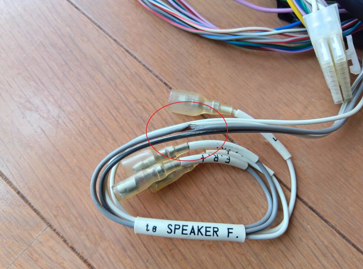 ・スピーカーケーブルの被膜が一部が裂けて銅線が露出しています。(写真6枚目)