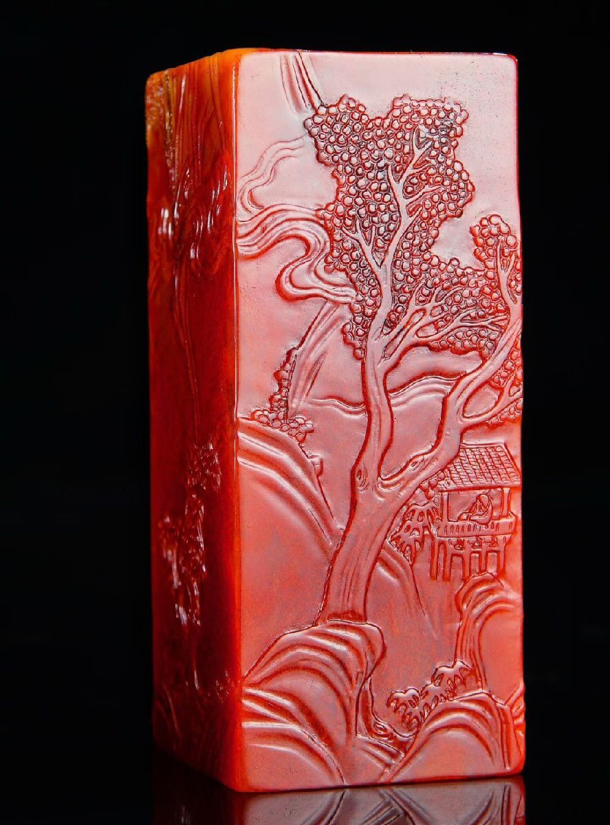 【安】清時代 寿山石 桃花凍石彫 松渓泛舟紋素章 印材 極細工 古置物 古擺件 中国古美術 時代物 316