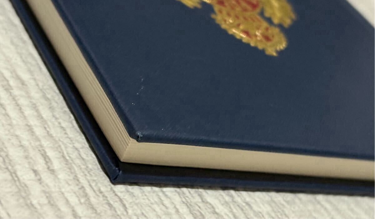 表紙のネイビーにゴールドのシグネチャーのエンブレム