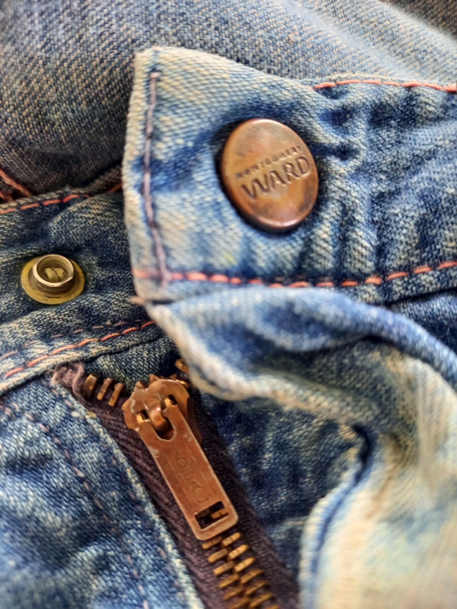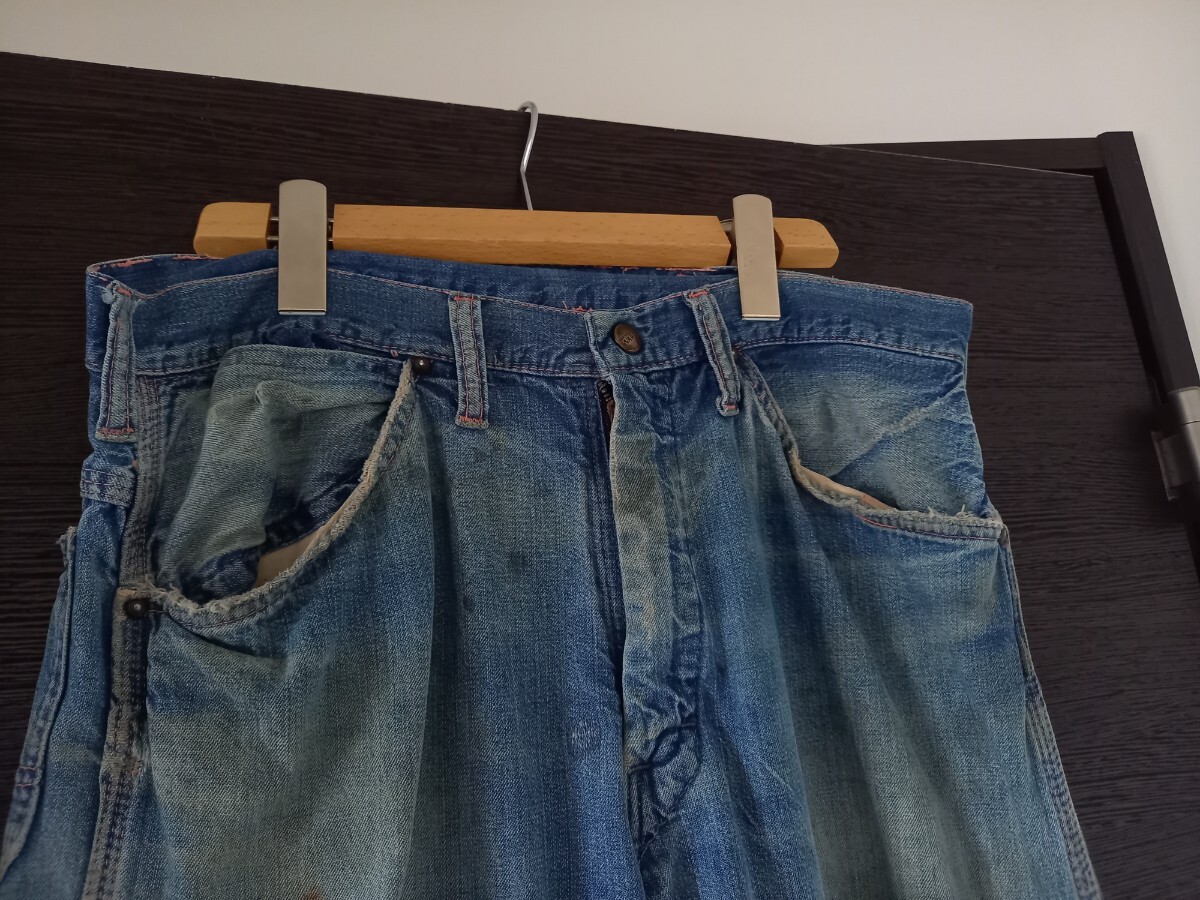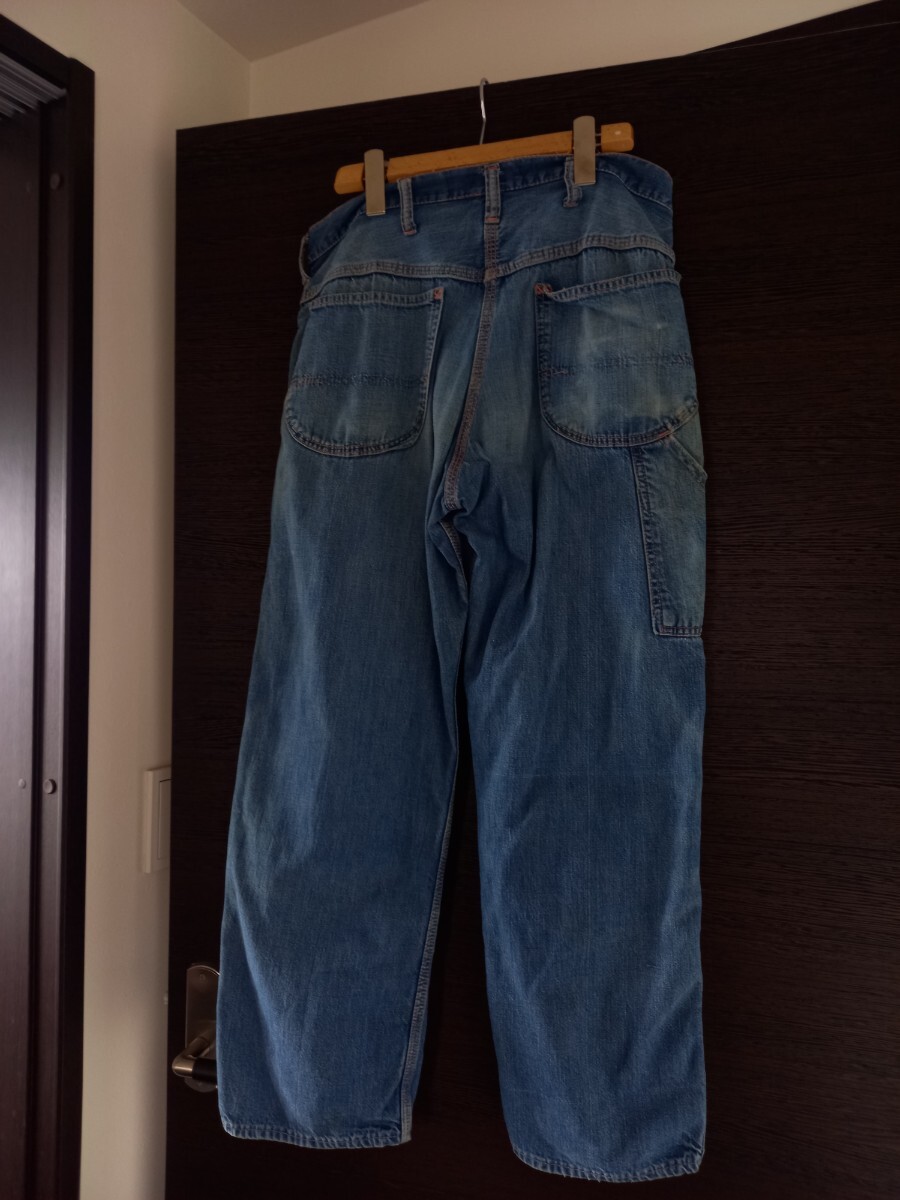 ビンテージ古着屋で購入したビンテージ 60s モンゴメリーワード ペインター ワーク 縦落ち デニム USA製 パッチワーク リペア パンツ sizeW33相当です。ウエスト約84レングス約72センチです。状態はビンテージならではのフェード感とカッコいいリペアがあります。生地も、まだまだ丈夫な方で全体的にまだまだ着用できる状態です。最近はパッチワーク的なリペアやフェードされたboroと言われるヴィンテージ物が高騰して人気もあります。
