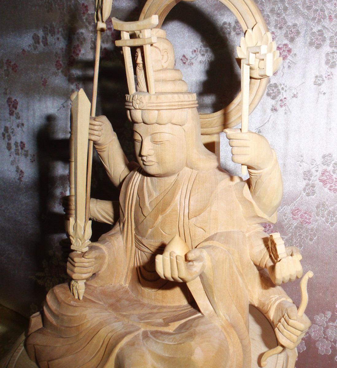 Product name: ◇25◇ 本柘植 ☆一刀彫☆ 八臂弁財天 (弁才天)弁天 辨財天 木地彫 台座彫上 1,686g 身丈3寸 いっとうぼり【信頼のヤフオク!実績25年】