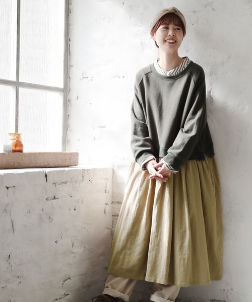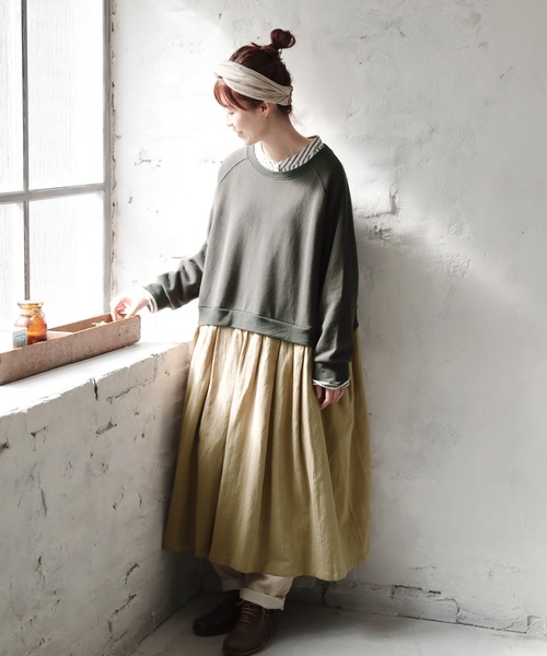 素材:身頃部分(綿100%), リブ(ポリエステル74%、綿24%、ポリウレタン2%), スカート部分(綿70%、麻30%), 袋布(綿70%、麻30%)