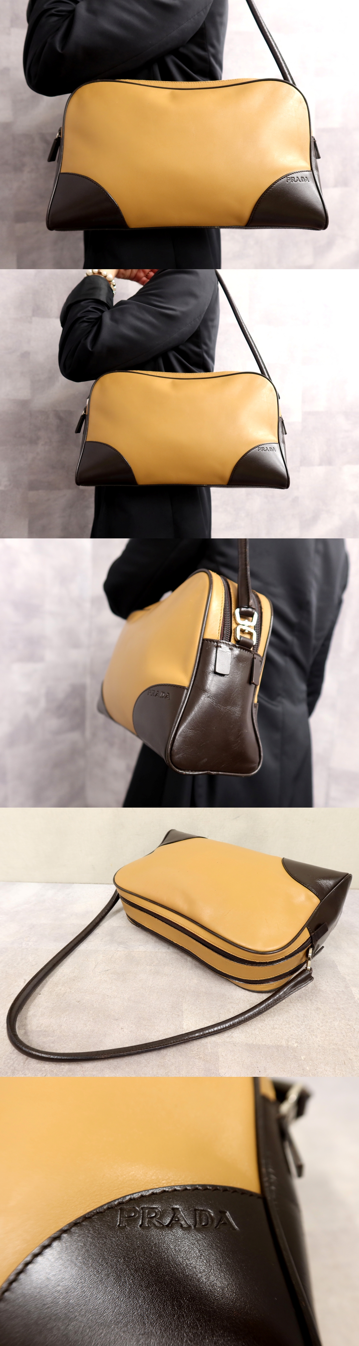 Store ●超美品●PRADA プラダ●カーフ レザー 本革●ショルダー バッグ●ゴールデンイエロー ブラウン●シルバー金具●イタリア製●Js65498