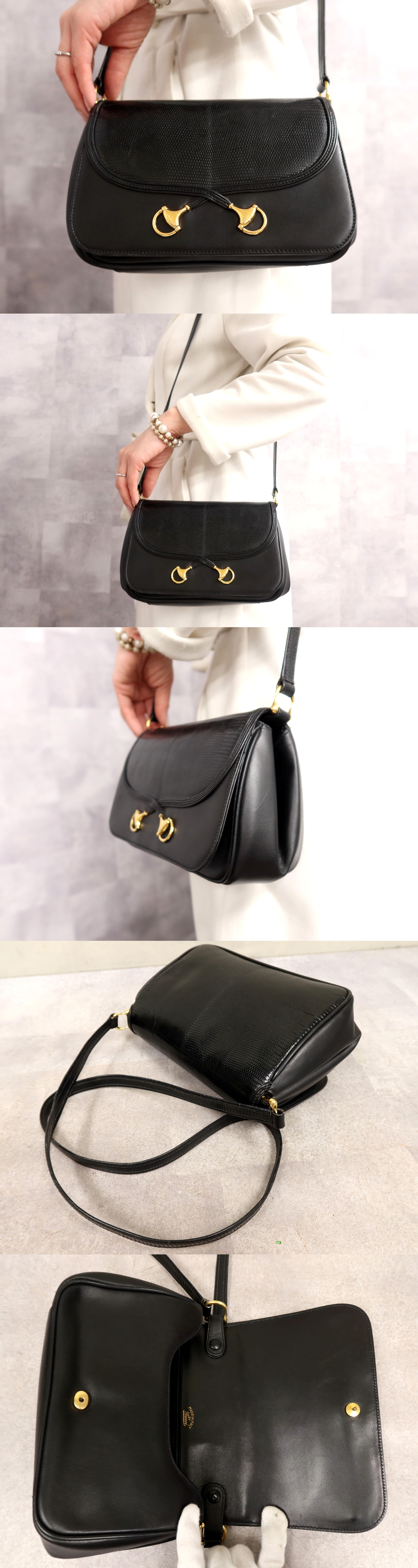 Store ●超美品●GUCCI オールド グッチ●ホースビット●リザード 本 トカゲ 革 レザー 本革●ショルダー バッグ●黒●G金具●斜め掛け●Js66219