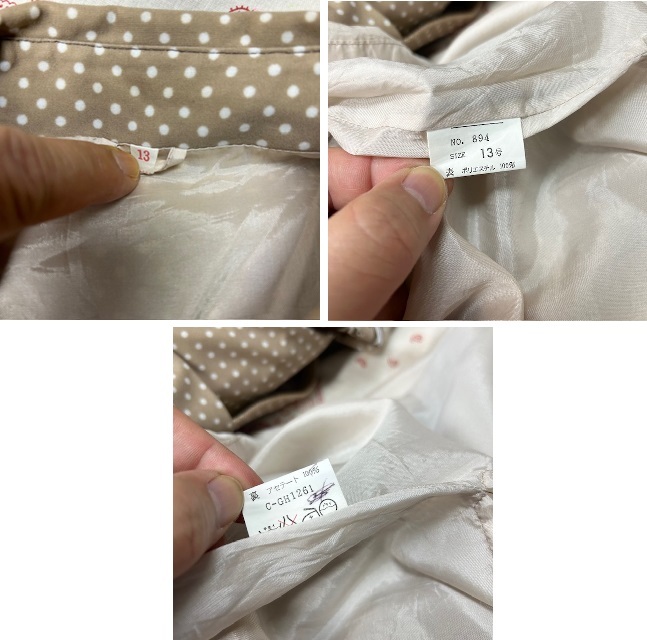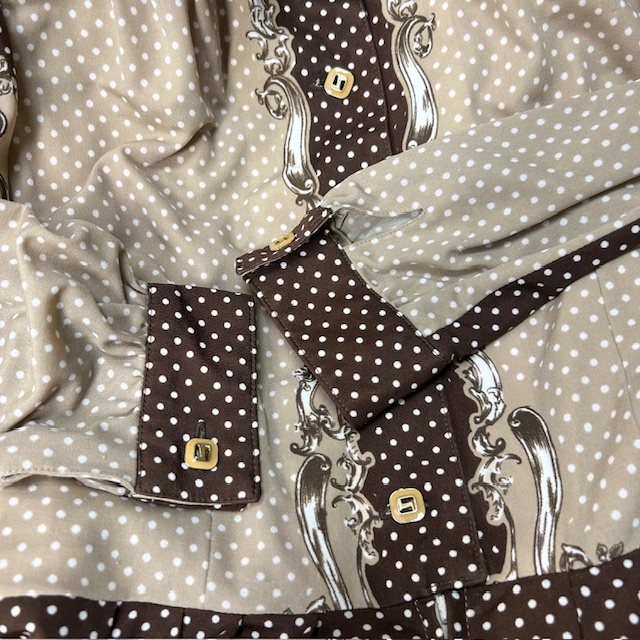 ●商品説明・・70年代~80年代頃のオールド・ヴィンテージの昭和レトロでクラシックなドットとレトロな柄を組み合わせたロングワンピースです。ベルト付きです。身頃部分は裏地付きになっています。素材はメインがポリエステル、裏値がアセテートで、70sレトロブラウスのような生地感で、合わせによって通年使っていただけるような生地感です。濃ベージュというかカフェオレのような色合いです。サイズ表記は13号ですが、70s頃のやや小さめな作りで、今のM~小さめL程度のサイズ感かと思います。(オールド物ですので、肩パットがある物は取り外してあります)