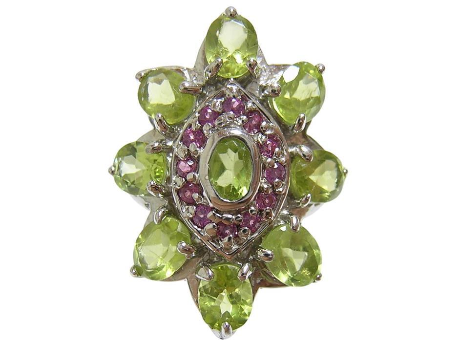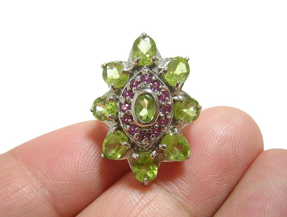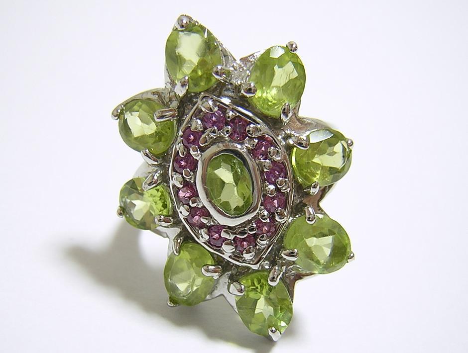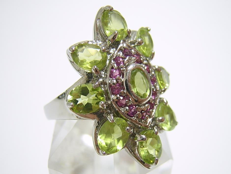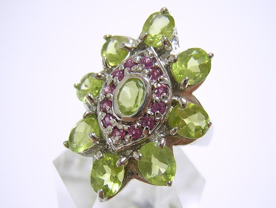 天然ペリドットとロードライトガーネットを使用したデザインリングです。