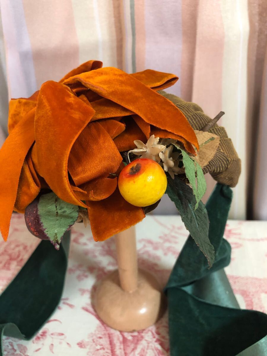 Product name: フランスアンティーク ヴィンテージ美しいコワフ ボンネット1点物!秋色オレンジリボンに木の実!ベルベット モード パーティ レア