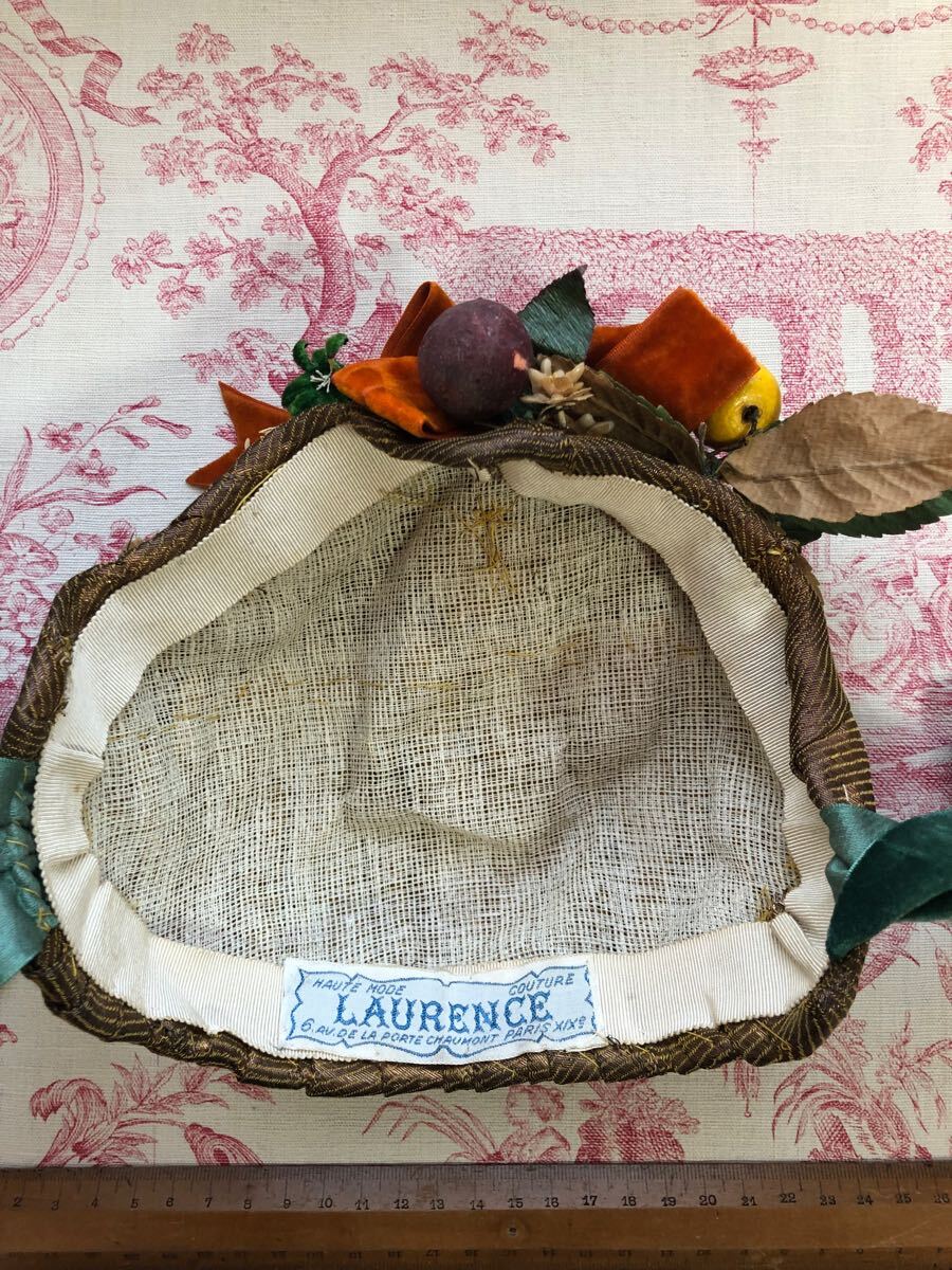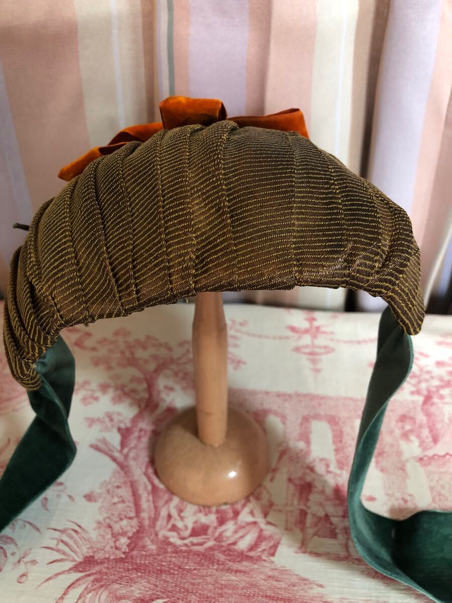 フランスアンティーク ヴィンテージ美しいコワフ ボンネット1点物!秋色オレンジリボンに木の実!ベルベット モード パーティ レア