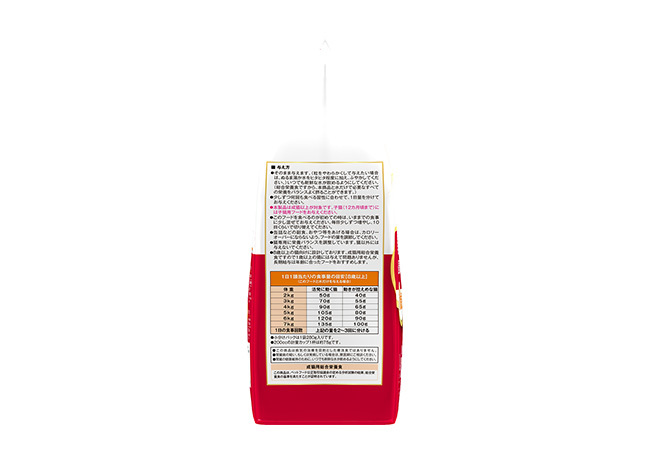 原材料(成分) 穀類(トウモロコシ、小麦粉、コーングルテンミール、パン粉)、肉類(牛肉粉、豚肉粉)、油脂類(植物性油脂、動物性油脂)、フィッシュパウダー、オリゴ糖、アップルファイバー(セラミド源)、海藻粉末(DHA源)、コエンザイムQ10、乳酸菌加熱菌体、GABA、ミネラル類(カルシウム、カリウム、ナトリウム、クロライド、銅、亜鉛、ヨウ素)、ビタミン類(A、B1、B2、B6、B12、D、E、K、ニコチン酸、パントテン酸、葉酸、コリン)、酵母細胞壁(食物繊維源)、pH調整剤、アミノ酸類(タウリン、トリプトファン、メチオニン)、酸化防止剤(ミックストコフェロール、ローズマリー抽出物)、ヒアルロン酸