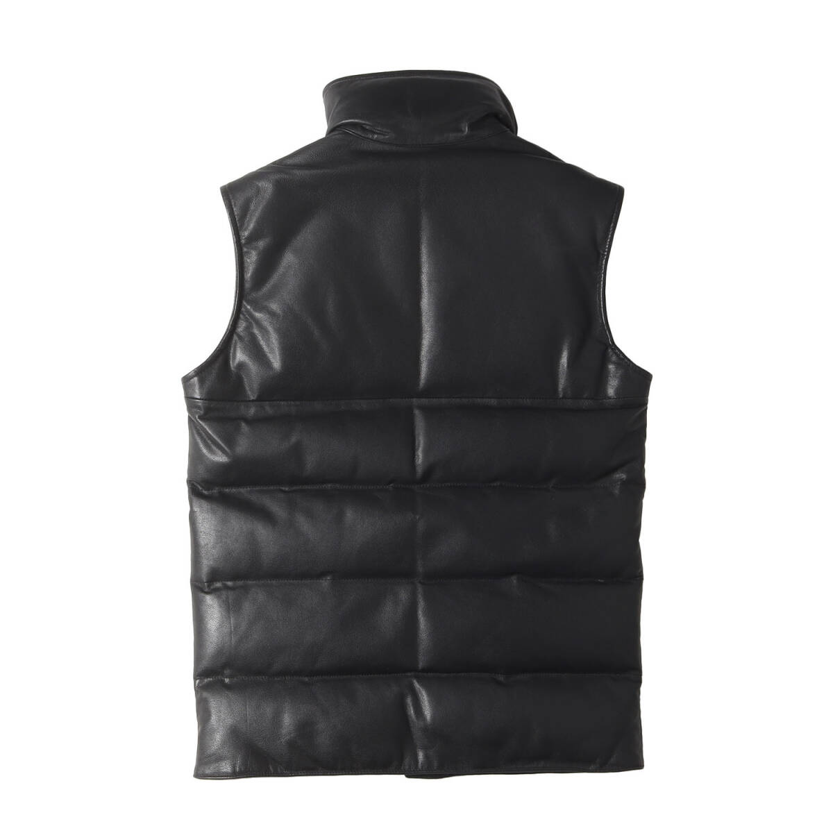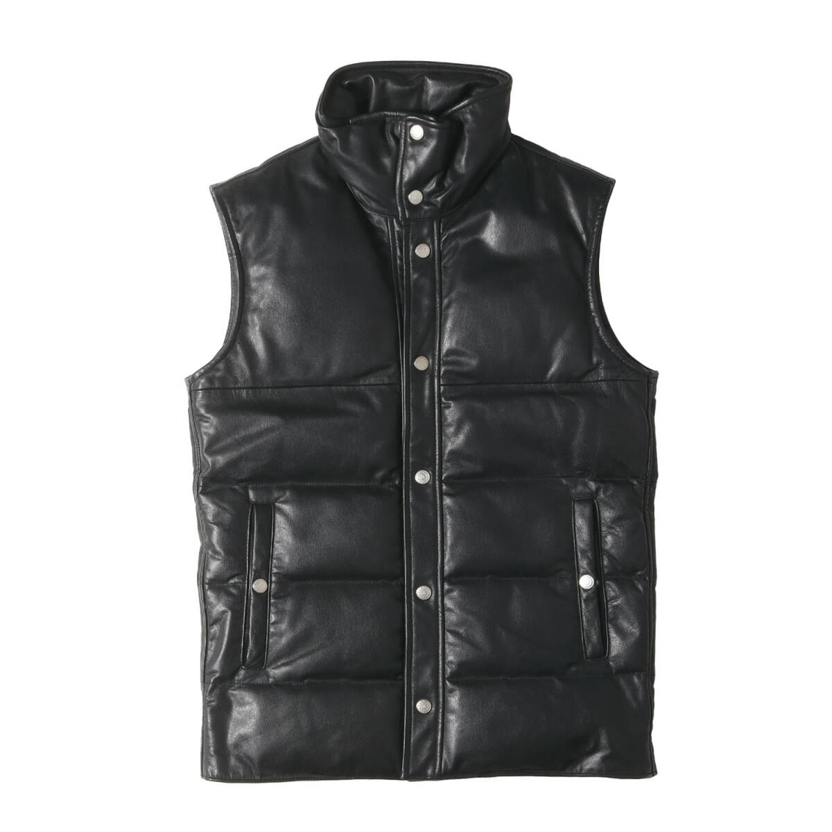 しっかりとした肉厚の堅牢なゴートスキンレザーを使用し、ハイネックデザイン、フロントスナップボタン仕様で仕上げられたレザーパテッドベストです。