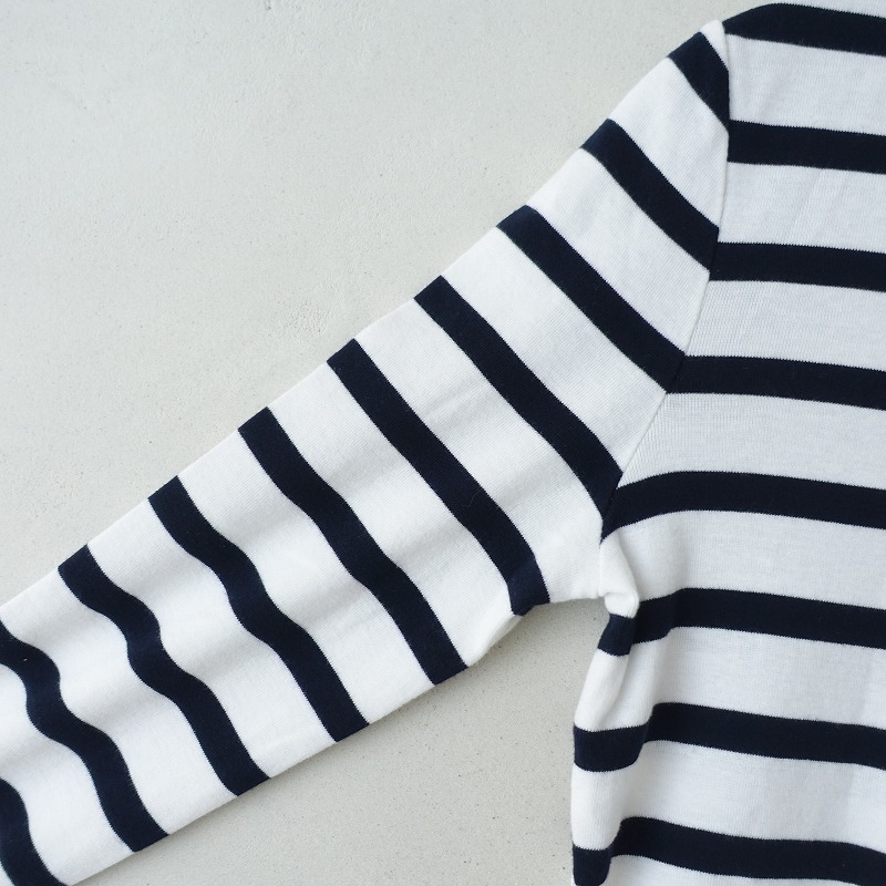 LAURENのコットンボーダーロングスリーブTシャツです。カラーは白×黒です。コットンのふっくらとした優しい肌触りのフライスニットで仕立てられています。ブラック無地のパイピングを施したラウンドネックに、ロングスリーブ、サイドに少しウエストラインを配したカットソーTシャツです。右前裾にワンポイント刺しゅうがあしらわれております。ポケットはございません。定価(メーカー希望小売価格)11,000円の商品です。