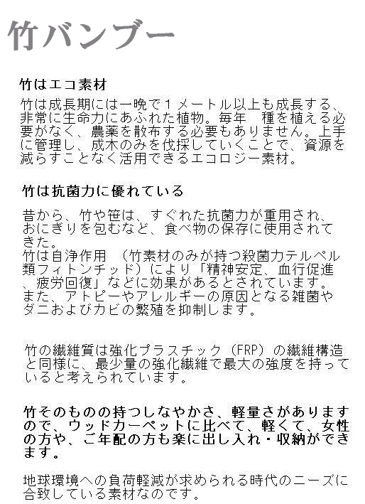 ■竹そのものの持つしなやかさ、軽量さがありますので、ウッドカーペットに比べて、軽くて女性の方や、ご年配の方も楽に出し入れ・収納ができます。