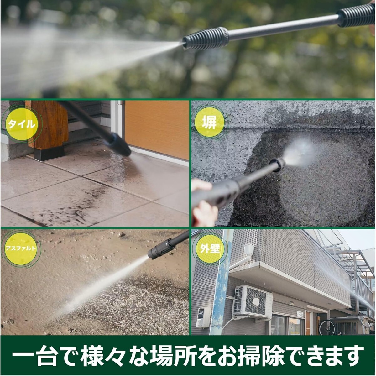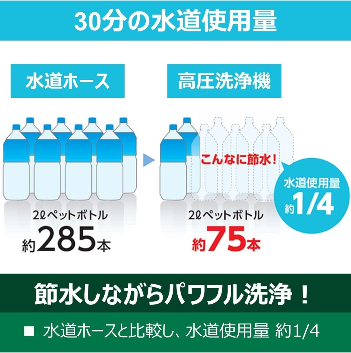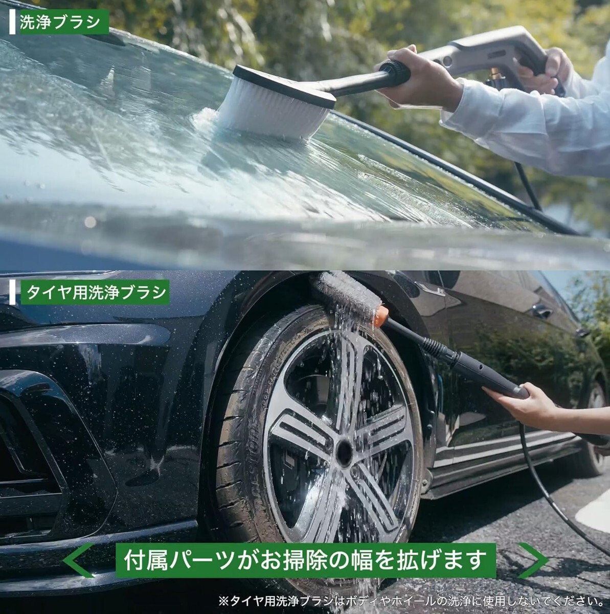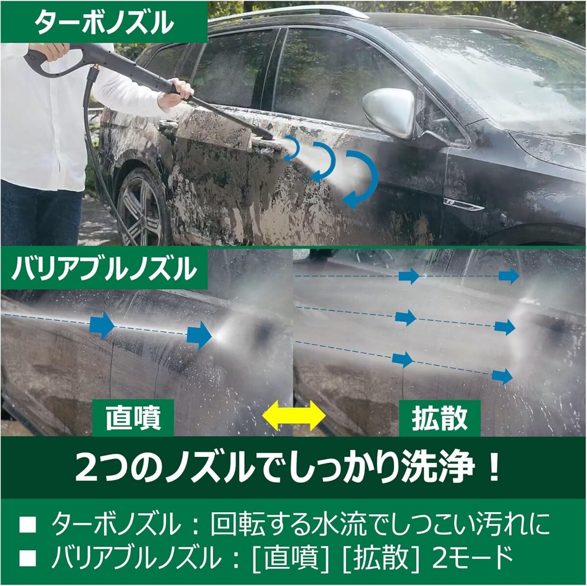 標準付属:トリガガン・高圧ホース(10m)・バリアブルノズル・ターボノズル・フォームボトル・タイヤブラシ・洗浄ブラシ・水道ホース(3m)・ワンタッチジョイント・給水コネクタ・ホースバンド・ノズルクリーナピン・ハンドル(取付用ねじ4個付)