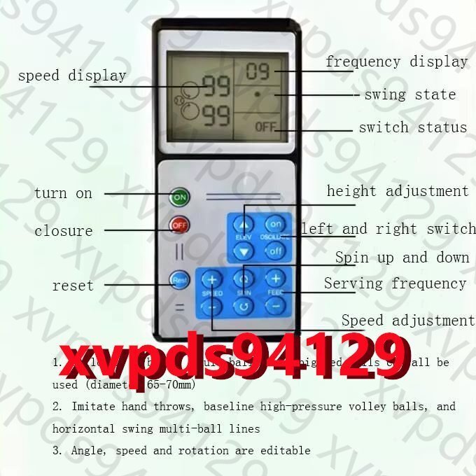 仕様:頻度: 1.5 ~ 10 秒/ボール標高範囲: 20-70バッテリー寿命: 2 ~ 4 時間制御モード: リモートコントロール速度: 10-60KM/Hリモコン距離: 10-12Mバッテリー特性: 24V5AHボール容量:50個(別売り)重量: 10kgパッケージリスト:1 * テニスボールマシン (ボールは含まれません)注記:電池は付属しておりません。