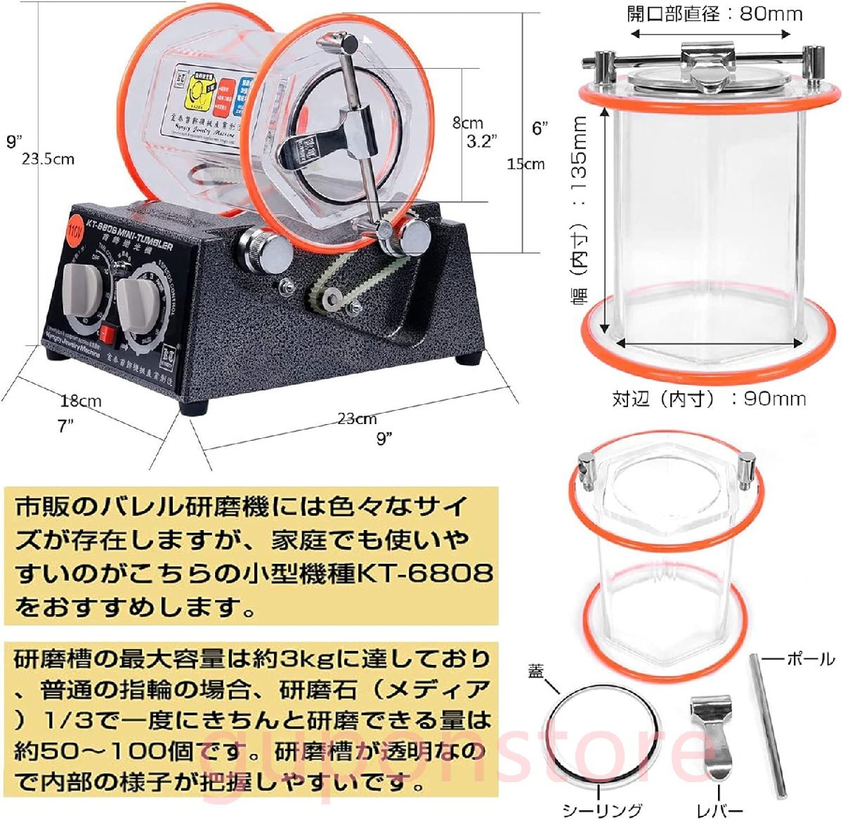 【最大容量3kg】市販のバレル研磨機には色々なサイズが存在しますが、家庭でも使いやすいのがこちらの小型機種KT6808をおすすめします。研磨槽の最大容量は約3kgに達しており、普通の指輪の場合、研磨石(メディア)1/3で一度にきちんと研磨できる量は約50~100個です。研磨槽が透明なので内部の様子が把握しやすいです。