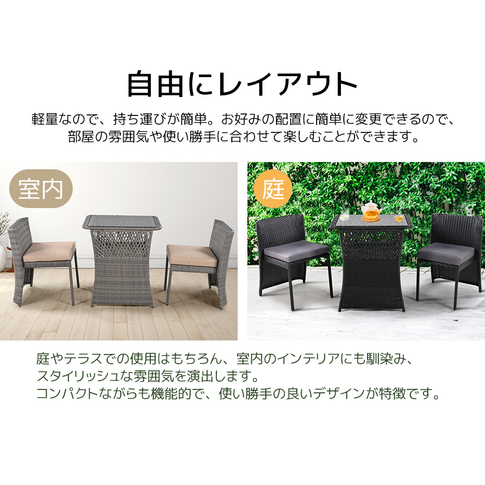 軽量なので、持ち運びが簡単。お好みの配置に簡単に変更できるので、部屋の雰囲気や使い勝手に合わせて楽しむことができます。庭やテラスでの使用はもちろん、室内のインテリアにも馴染み、スタイリッシュな雰囲気を演出します。コンパクトながらも機能的で、使い勝手の良いデザインが特徴です。