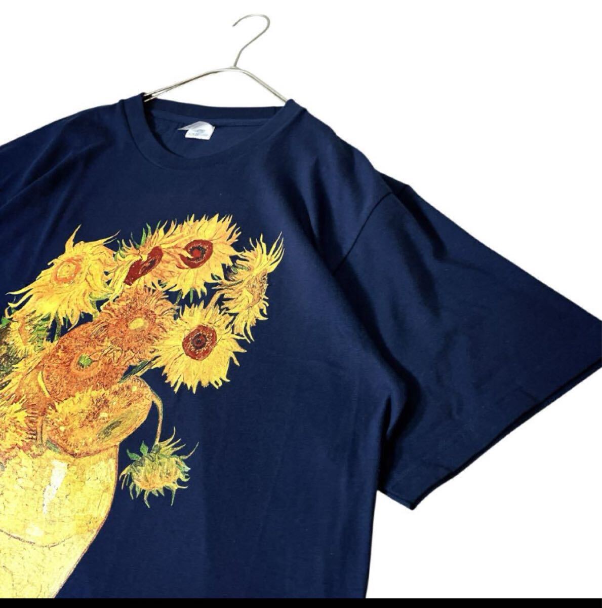 ゴッホ 名画「ひまわり」アートTシャツ 芸術 絵画 XL 紺ネイビー 新品未使用 Tシャツ グッドデザインプリント 半袖Tシャツ
