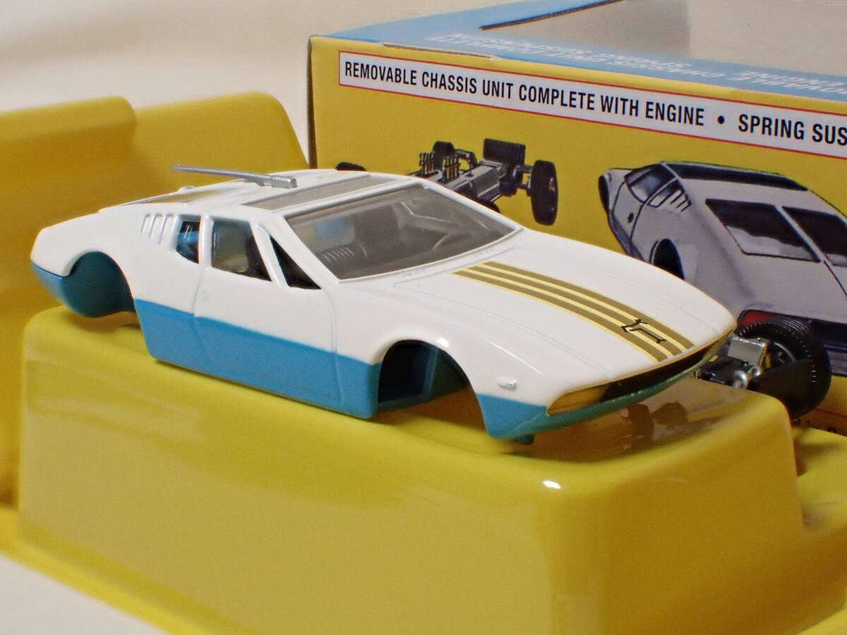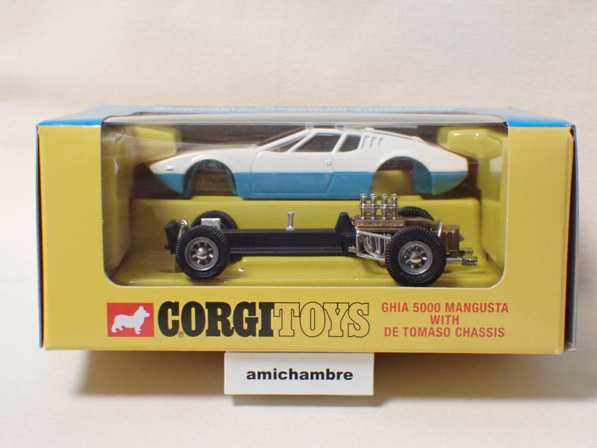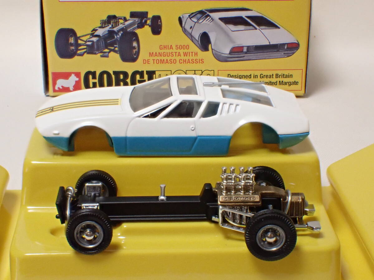 Corgi Toys 1/43 De Tomaso Mangusta       カロッツェリア・ギア時代のジウジアーロの代表作、デ・トマソ・マングスタのコーギー・リプロダクション・モデルです。おそらく、日本未輸入モデルだと思います。撮影のため開封しています。当時の雰囲気が細かく再現されています。ボディとバックボーンシャーシが分離し、サスペンション機構がございます。それでは、どうぞ宜しくお願い致します。