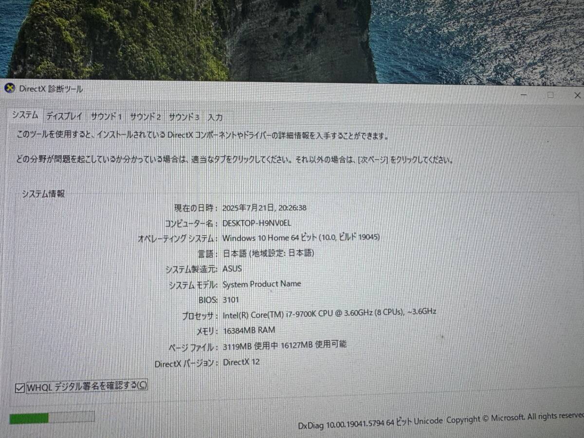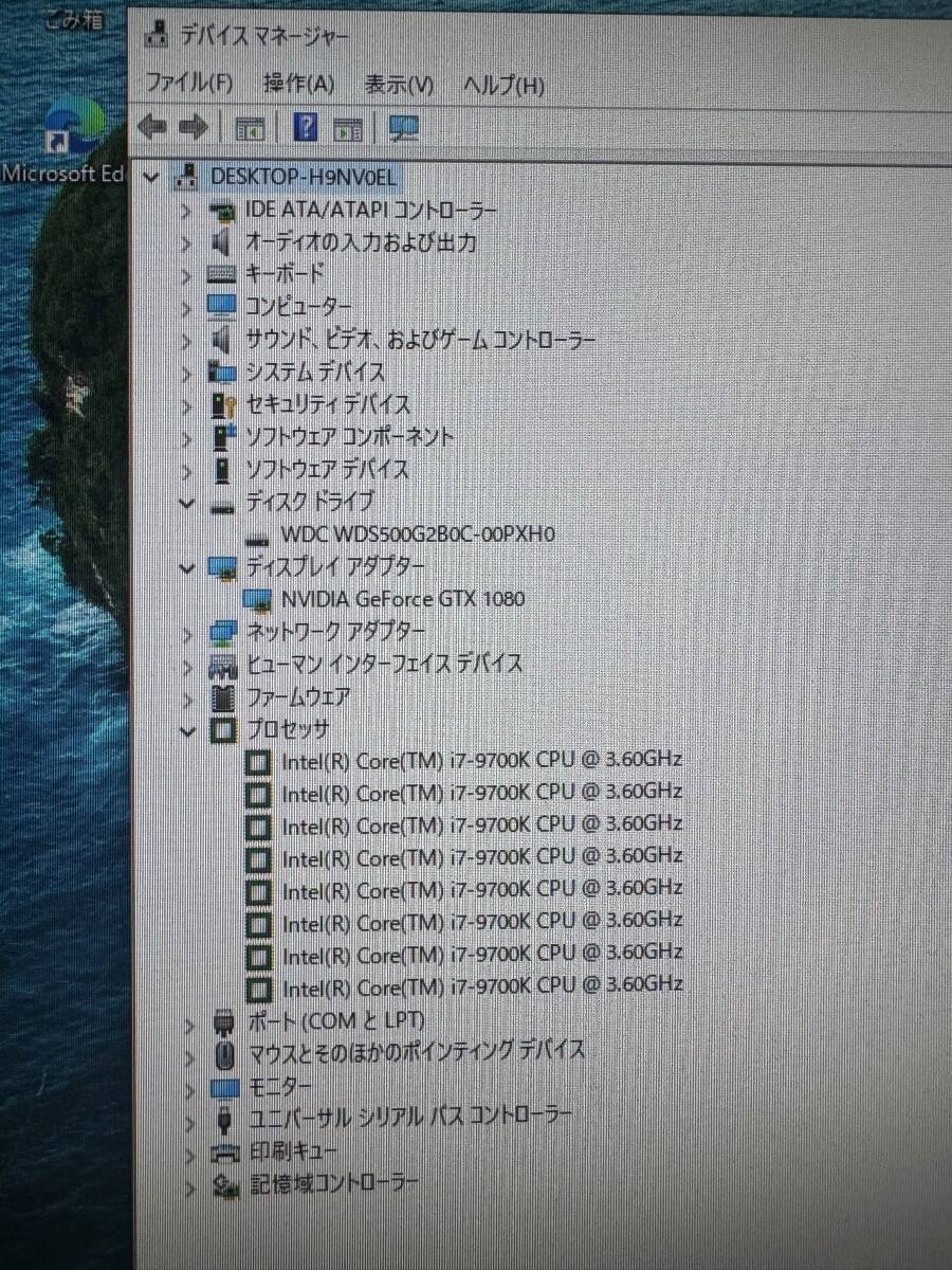 。CPU:Intel Core i7-9700K(Coffee Lake) 3.60GHz~4.90GHZ(8コア/8スレッド)