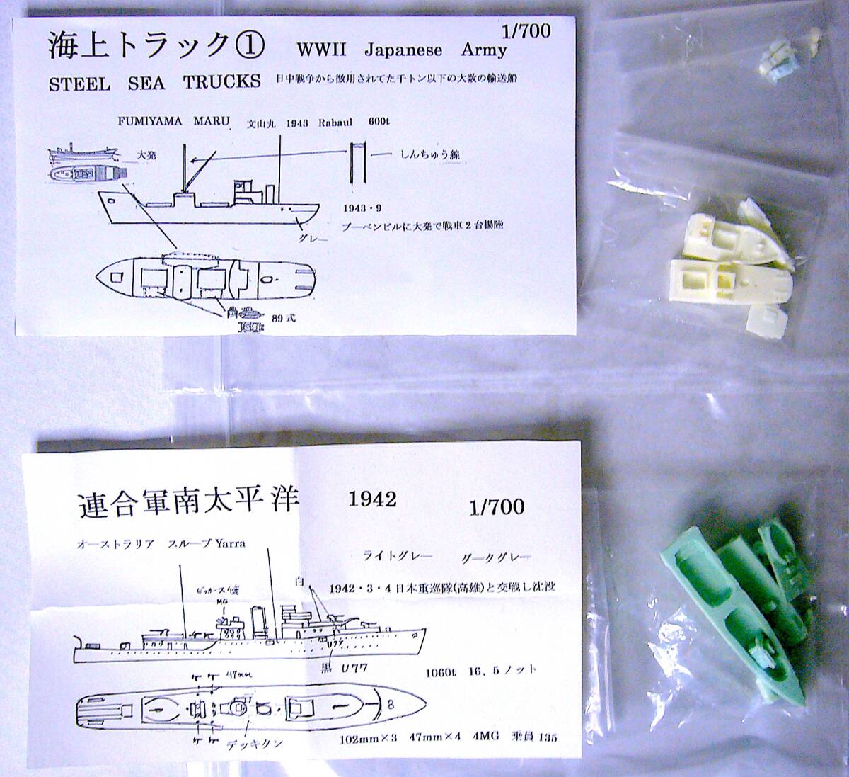 フェアリー企画 1/700 輸送船 小牧丸 / 鬼怒川丸 / 辰福丸 / 文山丸 / スループ Yarra / 潜水艦べシッコ & サウコ のレジンキャストキット(下記) 6個まとめ売りです。