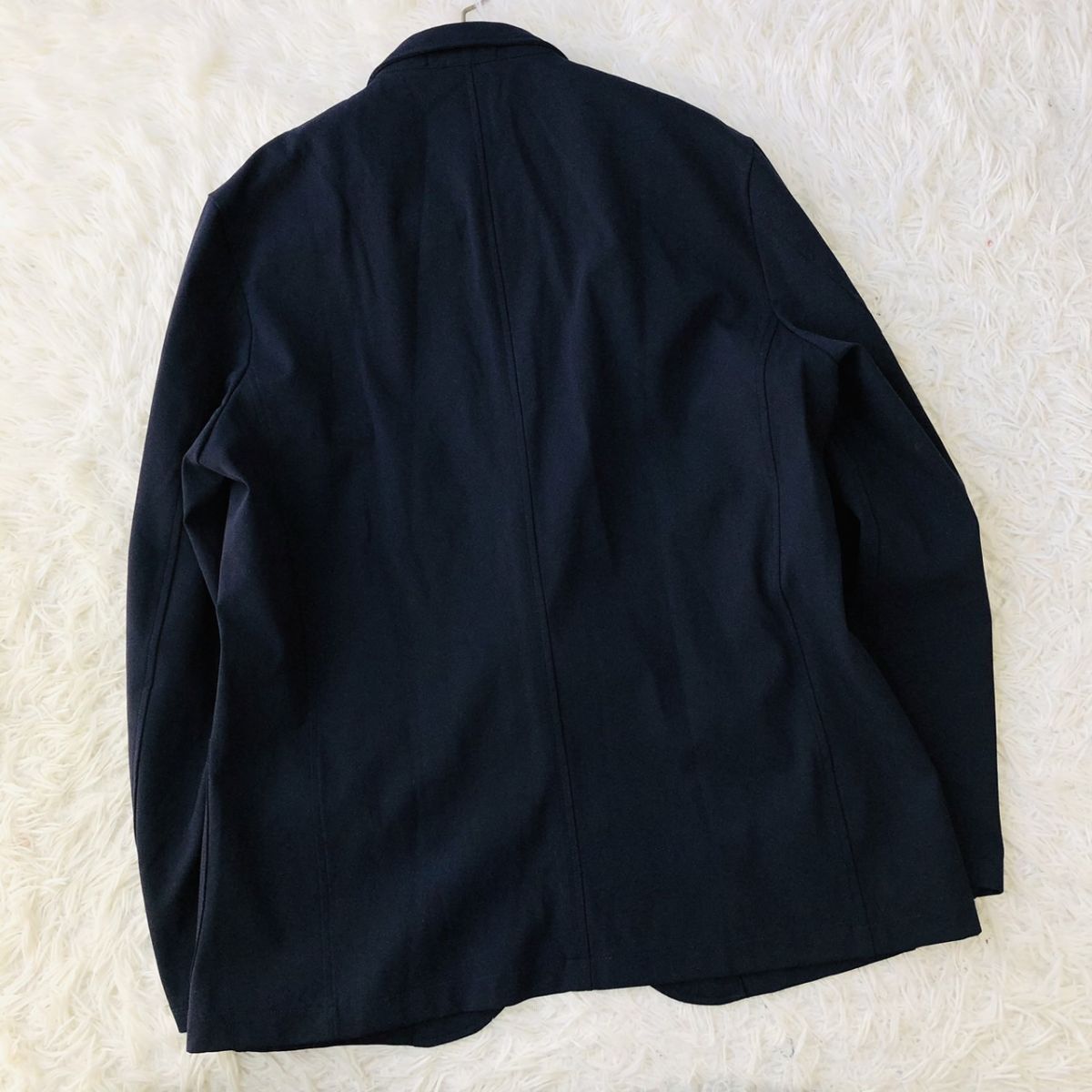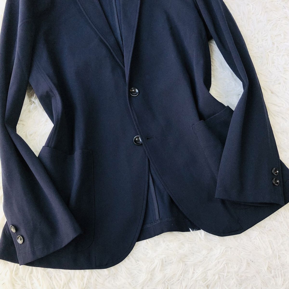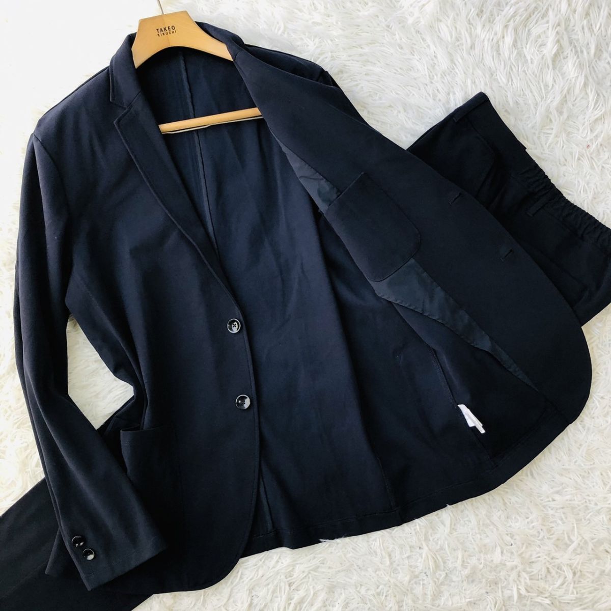 ストレッチが効いたネイビーのセットアップです。快適な着心地で、ビジネスシーンはもちろん、カジュアルにも着こなせる汎用性の高い一着です。