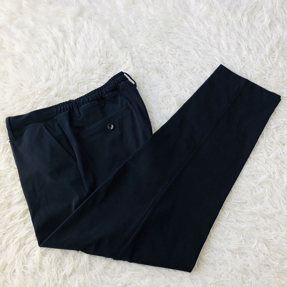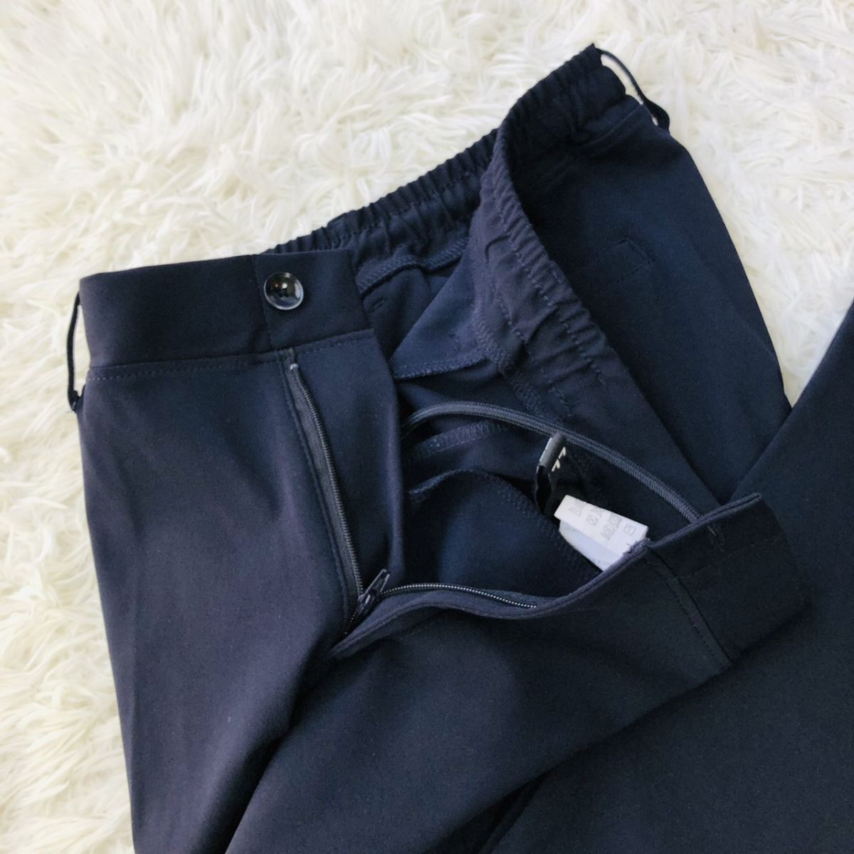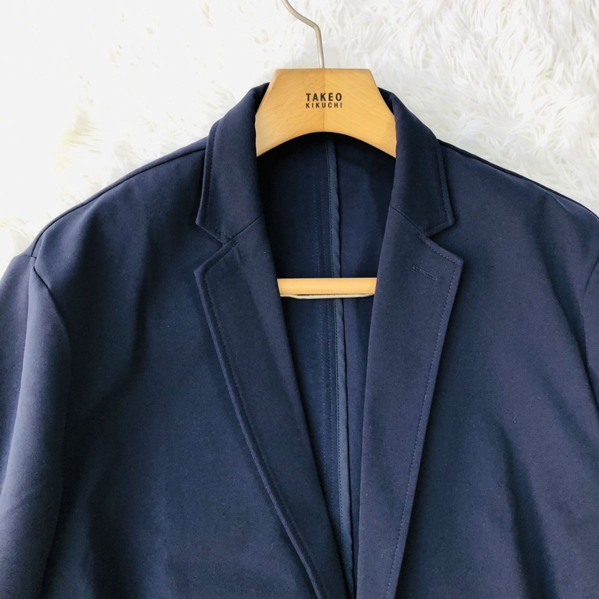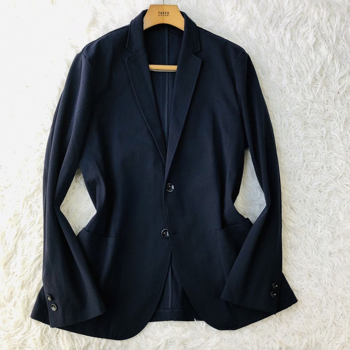 ストレッチが効いたネイビーのセットアップです。快適な着心地で、ビジネスシーンはもちろん、カジュアルにも着こなせる汎用性の高い一着です。