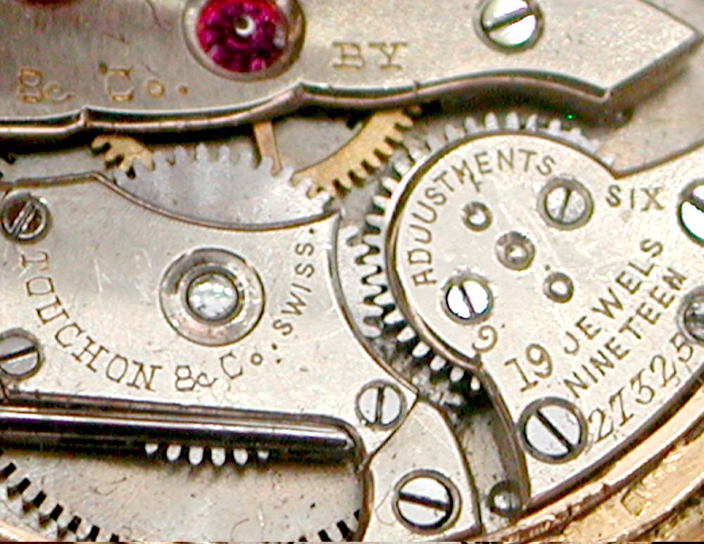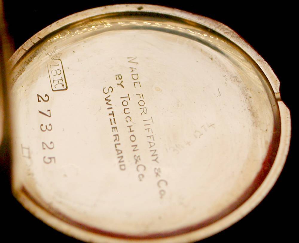 ●ケース●高級薄型18K金無垢ケースは裏に装飾 文字が施され、裏に MADE FOR TIFFANY & Co. BY TOUCHON & Co. SWITZERLAND 18K 27325 ( 機械Noも同じです) 、中蓋裏にも 18K 27325 が刻印されて傷・当たりも殆ど無く極上です。( 引き輪部分はブローチとしても使える様に回転する様に作られています)