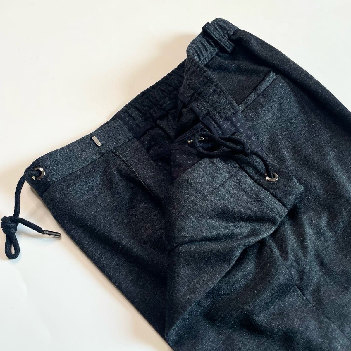 【ジャージー/ストレッチ】HUGO BOSS ヒューゴボス フラノ調 杢チャコールグレー イージーセットアップスーツ 52/XXL相当 ウエストゴム伸縮