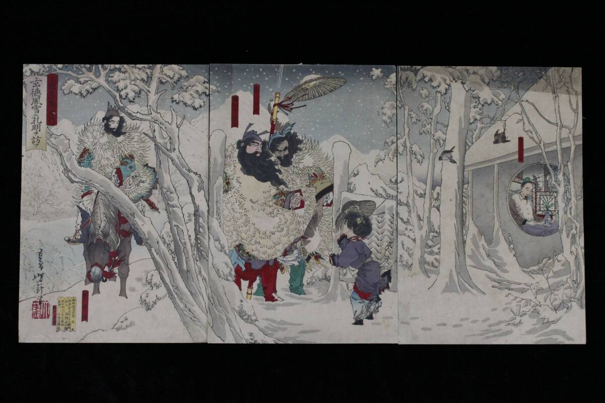 Product name: 【真作】 浮世絵 月岡芳年 木版画 『玄徳風雪ニ孔明ヲ訪フ 三顧の礼』 36×24cm(1枚当たり) 3枚続 台紙張 余白無 03404083-32